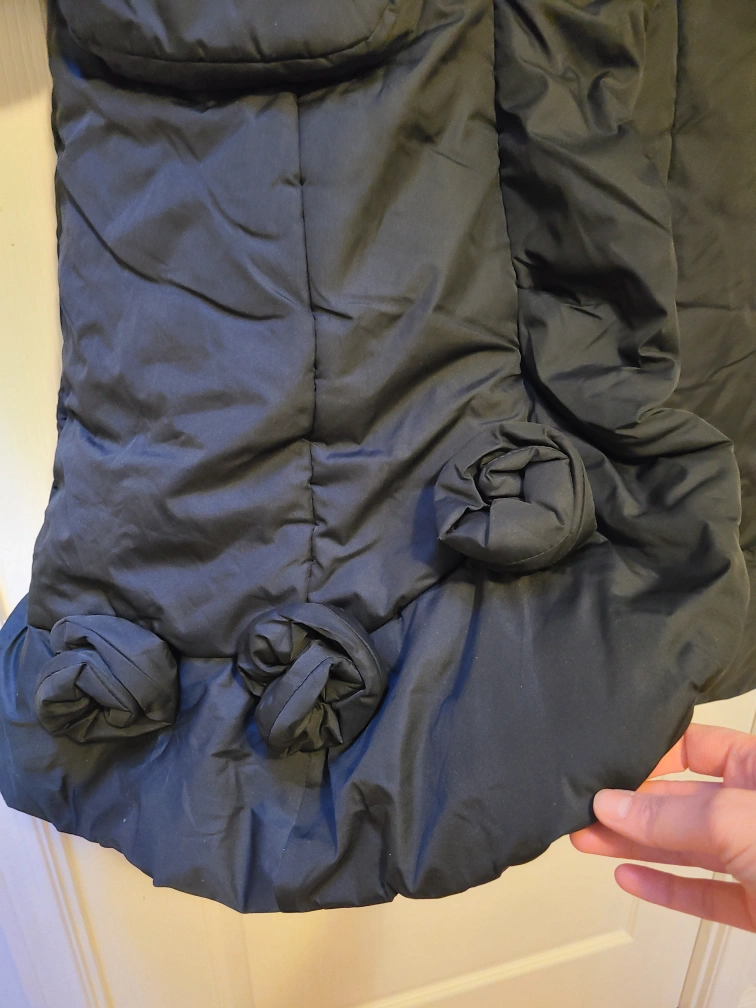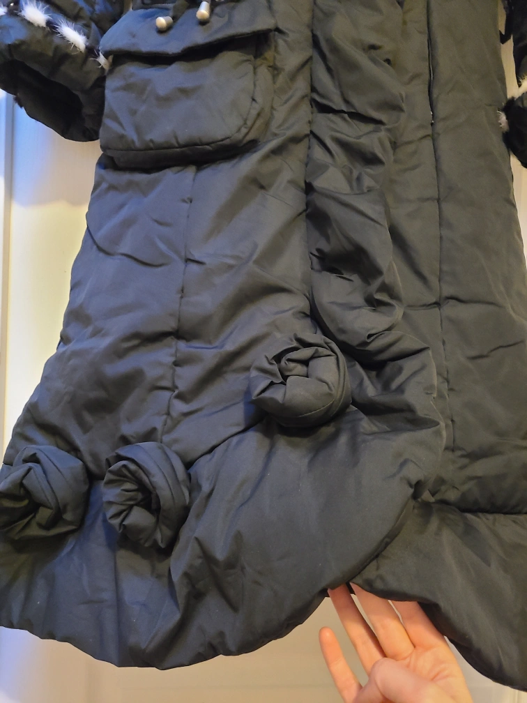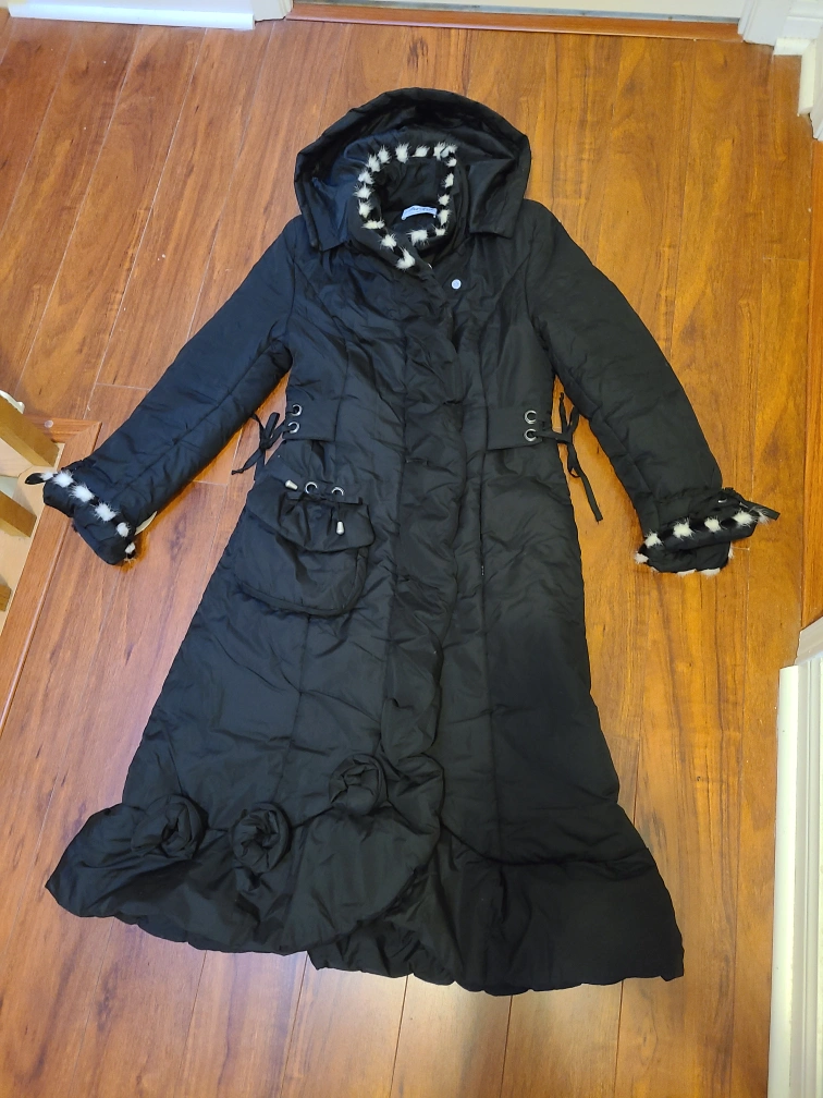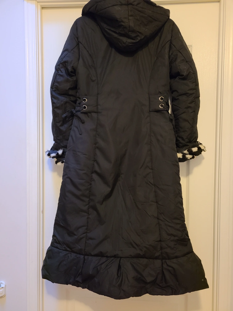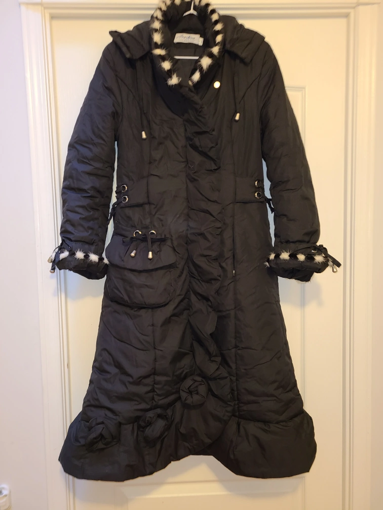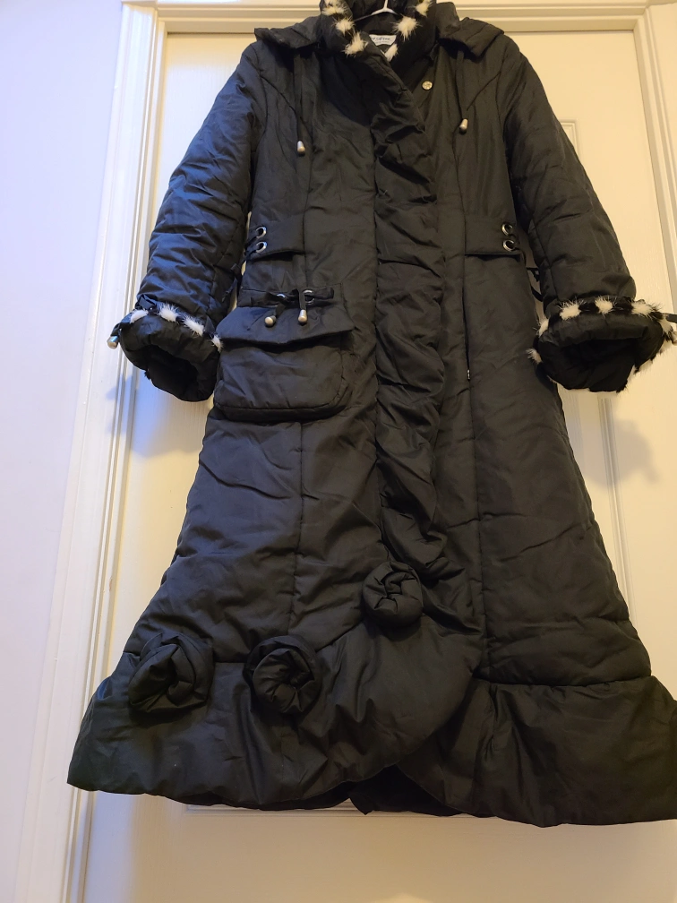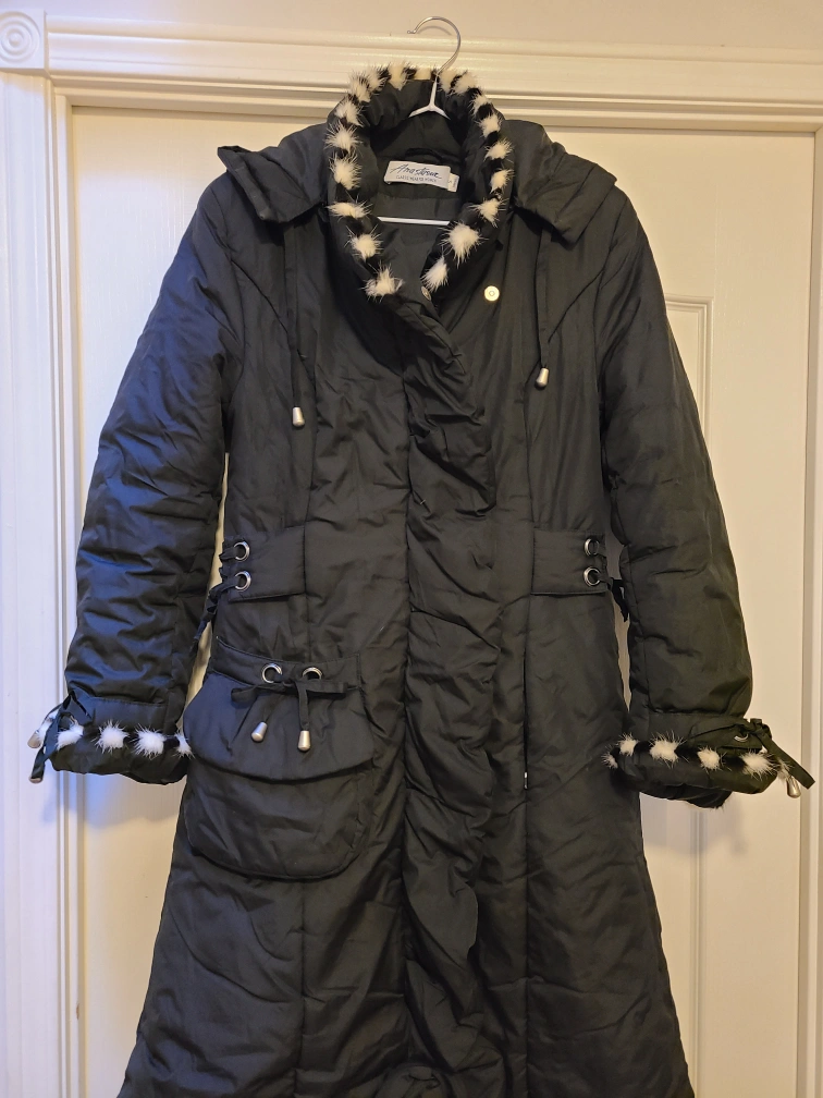 92Long black winter coat with fur trim on the hood and sleeves. Features a unique design with a ruffled skirt and a cinched waist. Size is Small with some extra room, or Medium fitted. GUC SF/PF home Pick up near Yonge and Finch