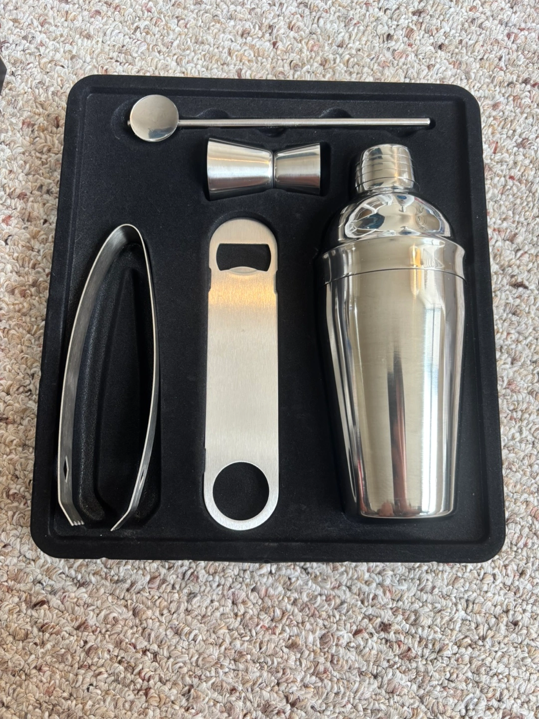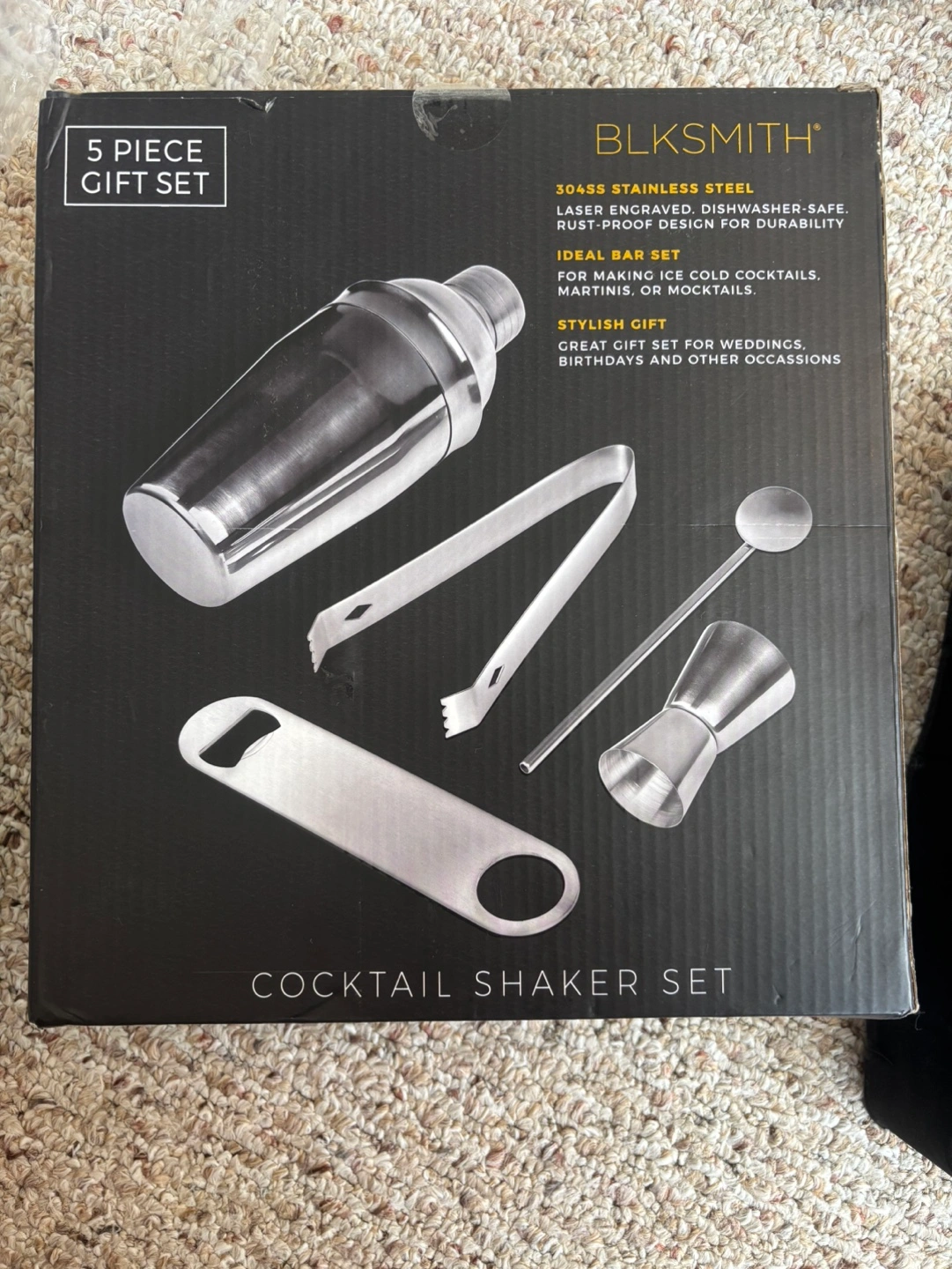 44unopened 5-piece stainless steel cocktail shaker set. Includes shaker, jigger, bar spoon, ice tongs, and bottle opener. Perfect gift. Durable, laser-engraved design. Dishwasher safe.