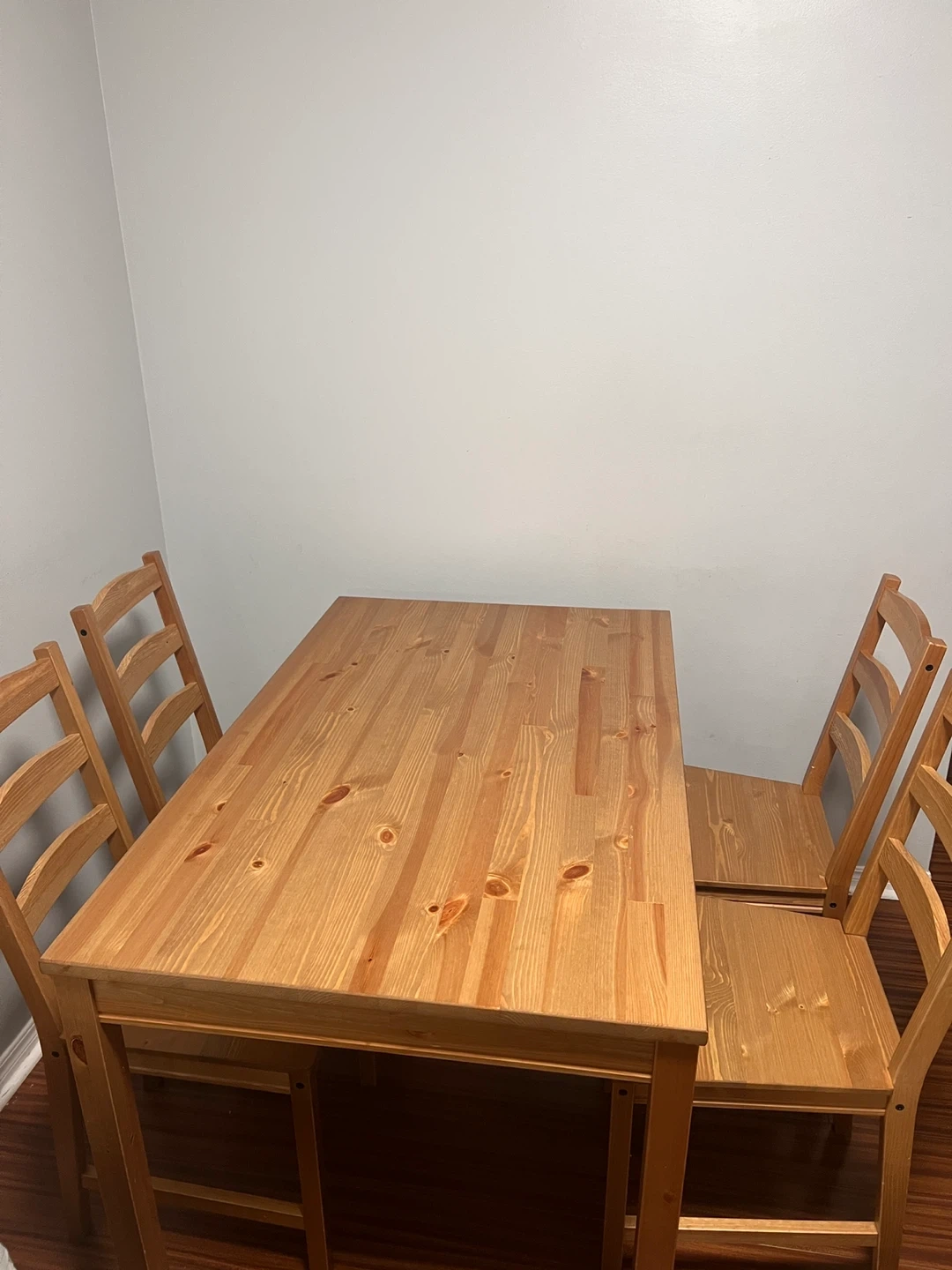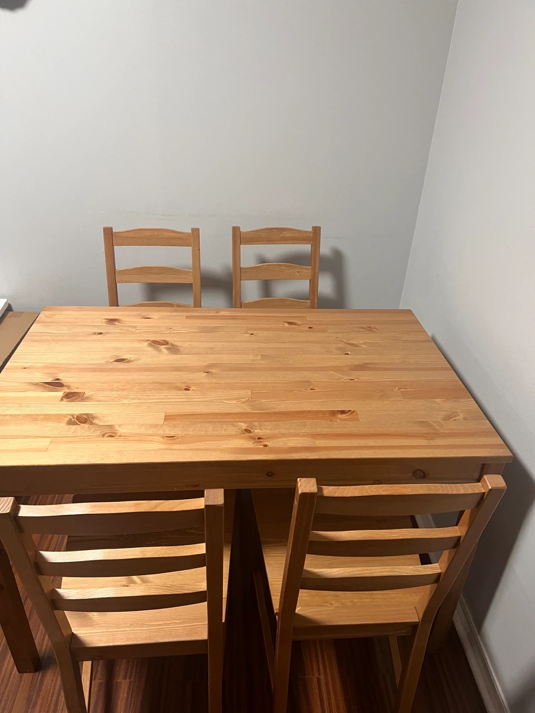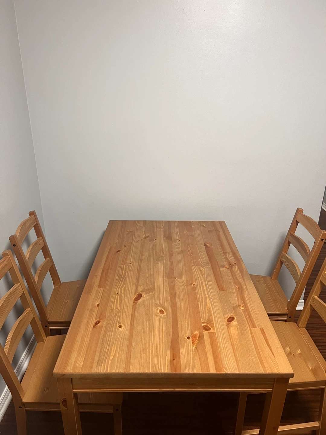 “Moving Sale” selling this lightly used dining table set with 4 sturdy chairs, in great condition. Used for only 2 years, well-maintained and looks almost new. Perfect for family meals or small spaces — elegant, durable, and ready to use with 4 grey chair pads from Ikea just for 20 dollars 5 dollar each. Available at a great price — grab it before it’s gone!