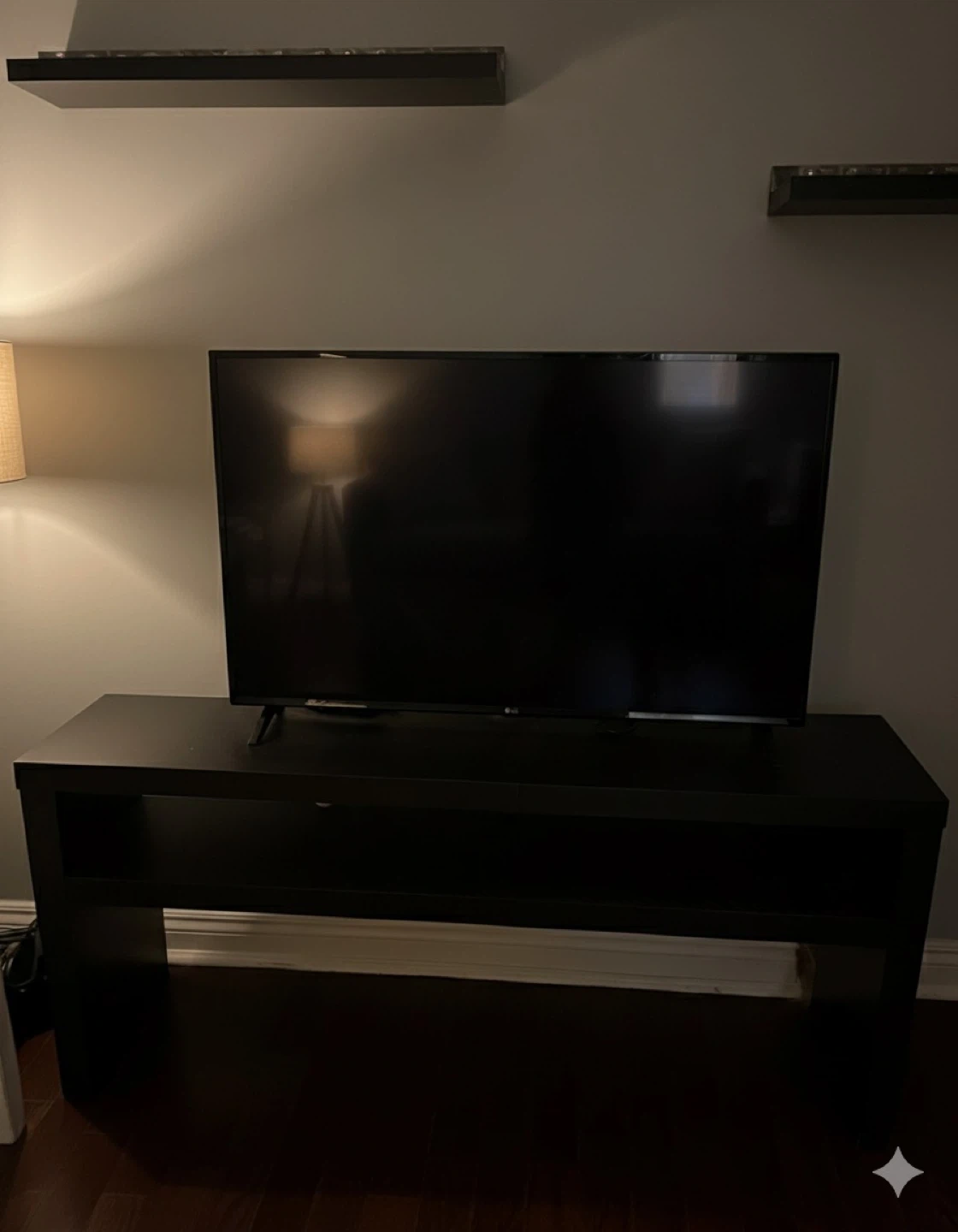 Selling an 40โ LG TV along with a black TV stand. It's a great set up for any living room or entertainment space. The TV is in good condition and the stand provides ample storage with its open shelving design.