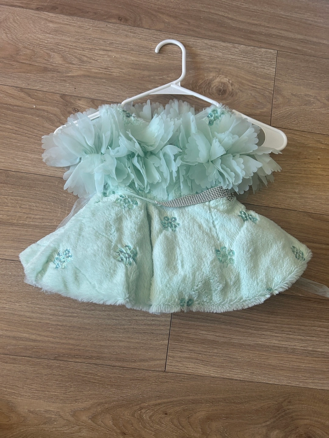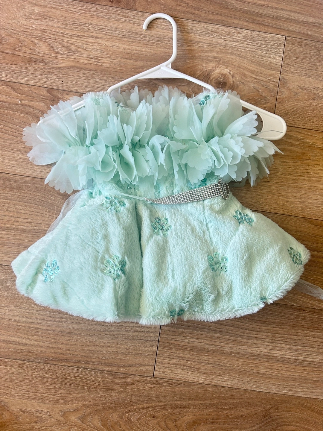 Moving Sale‼️Adorable mint green baby girl's dress. Features a fluffy texture, sparkly embellishments, and a pretty flower detail at the top. Perfect for parties or photoshoots. Size not specified.