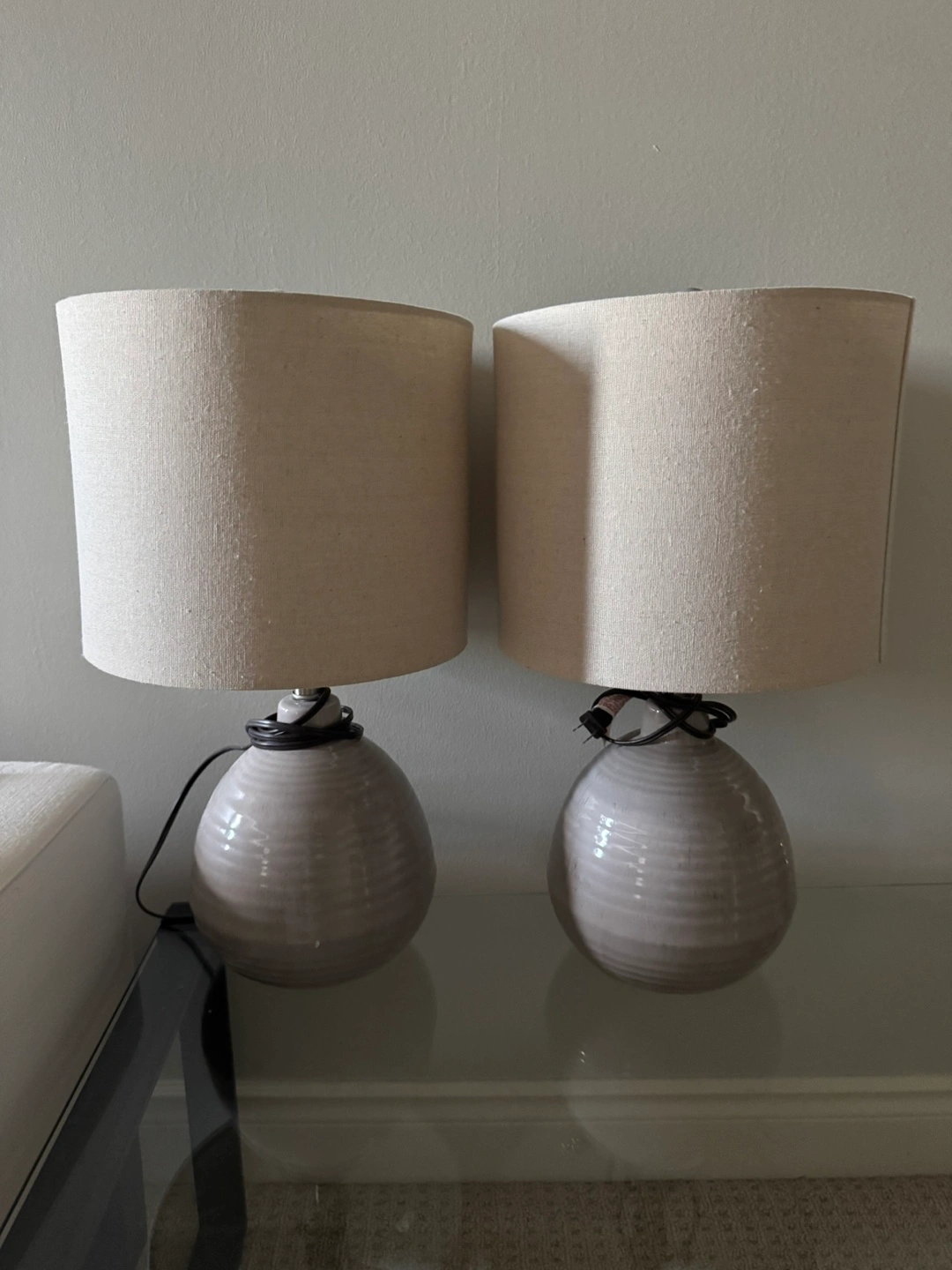 57Set of two table lamps. Ceramic bases, light grey colour. Linen lampshades. Neutral colour palette. Perfect for a bedside table or living room.