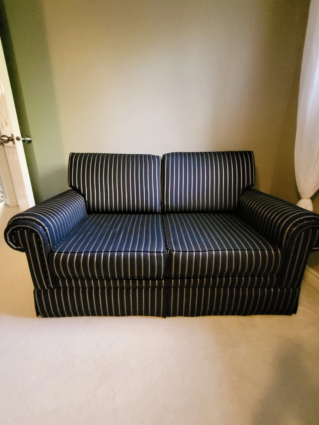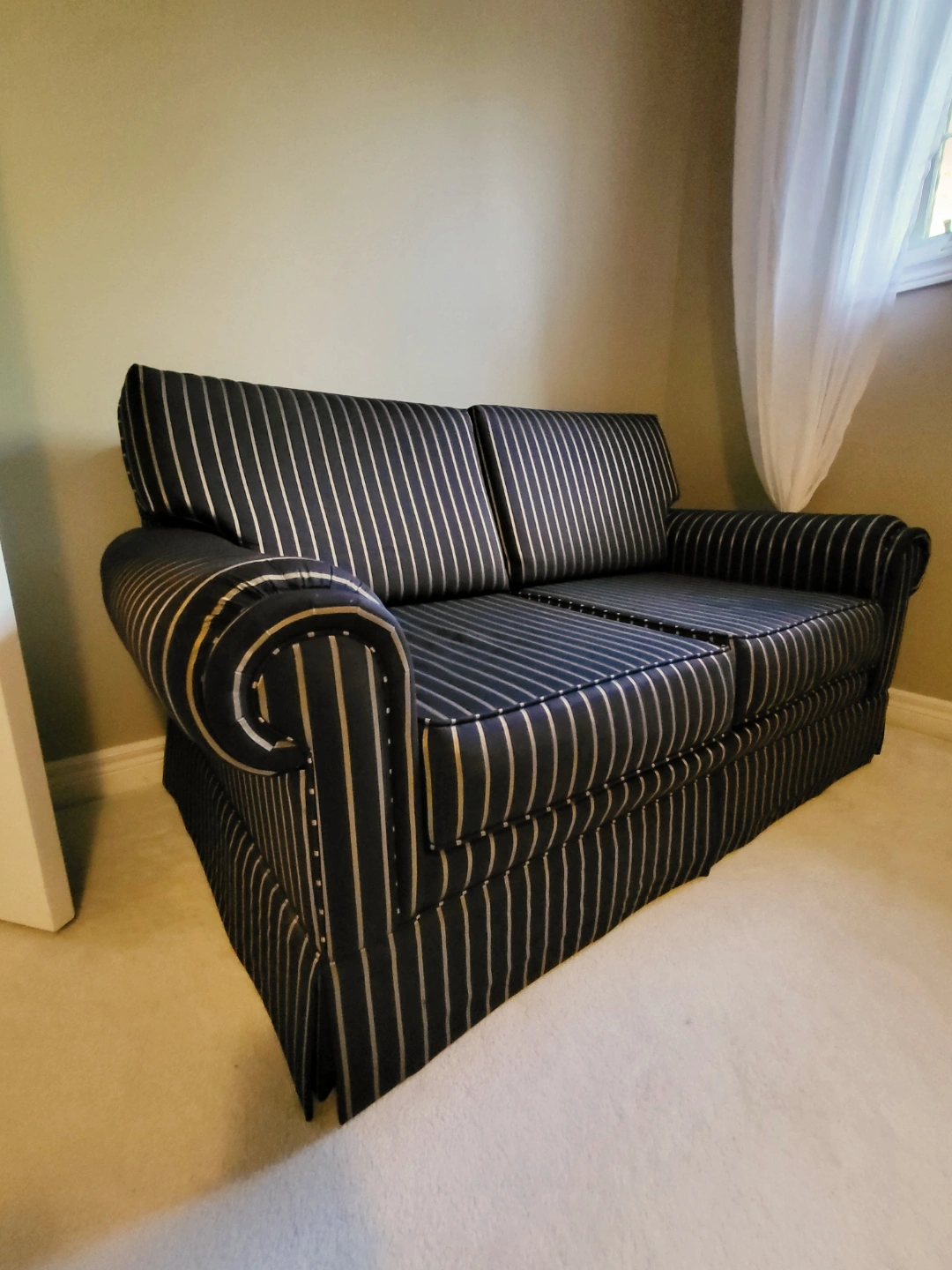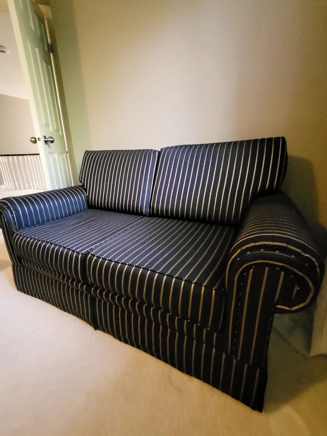 180Sofa with a striped pattern. Features rolled arms. The sofa's fabric appears to be dark in colour, contrasted by the silver stripes. Consider enjoying a quiet evening of relaxation on it.