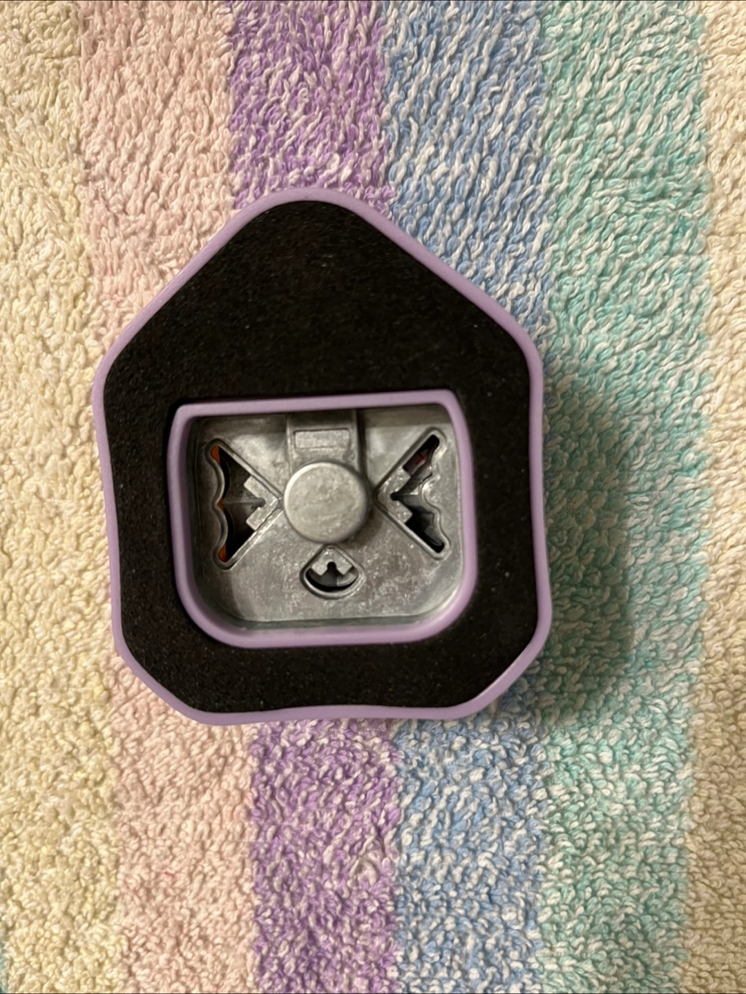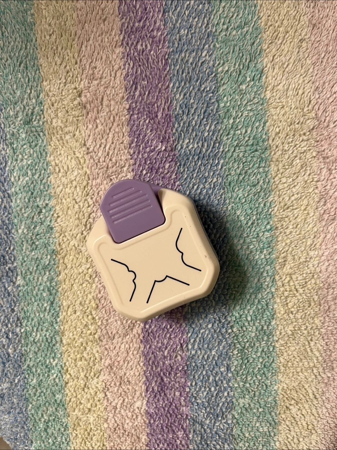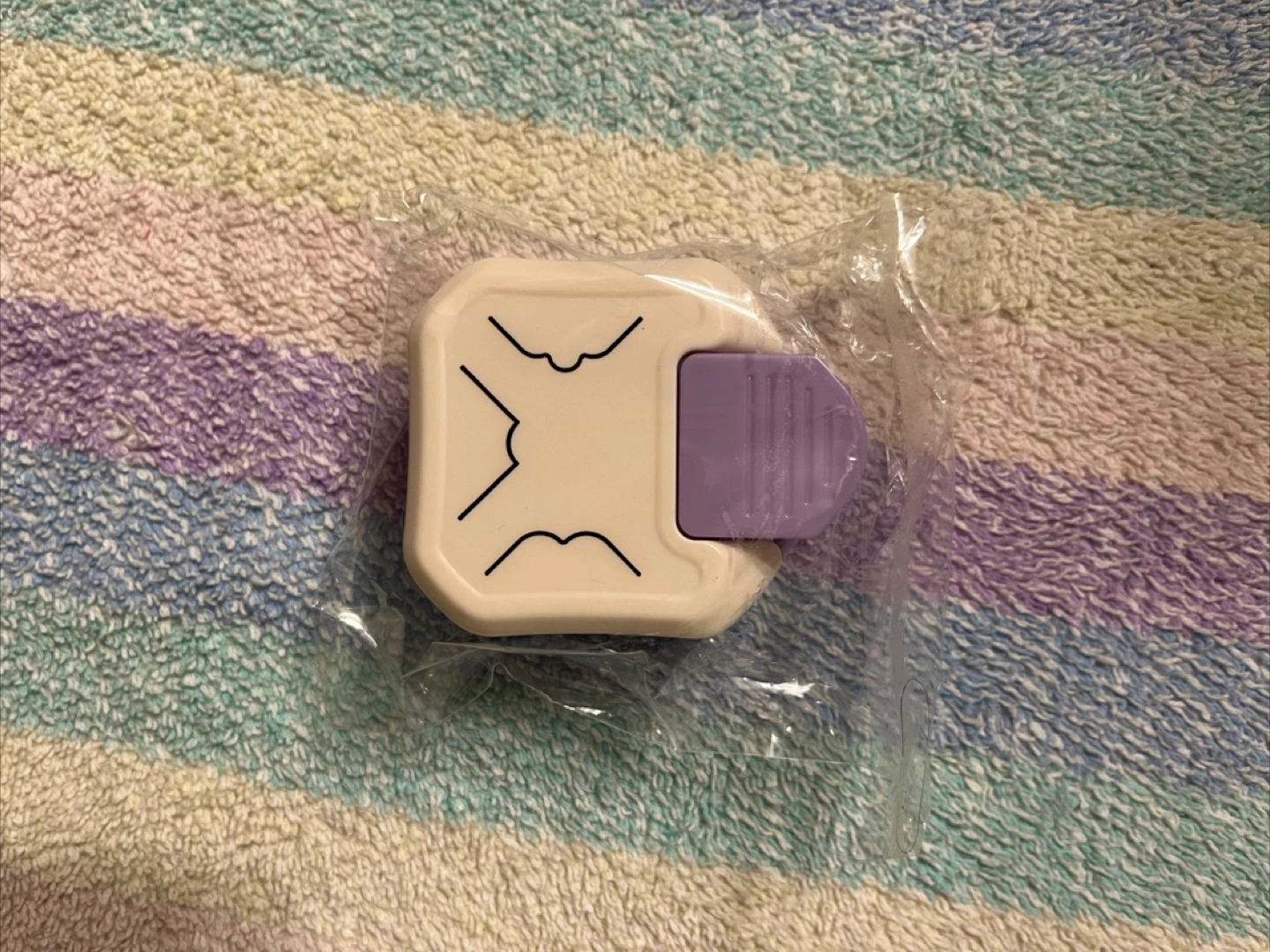 A brand new, unused crafting punch. Featuring a white body with a purple lever. A great item to have when starting a new hobby.