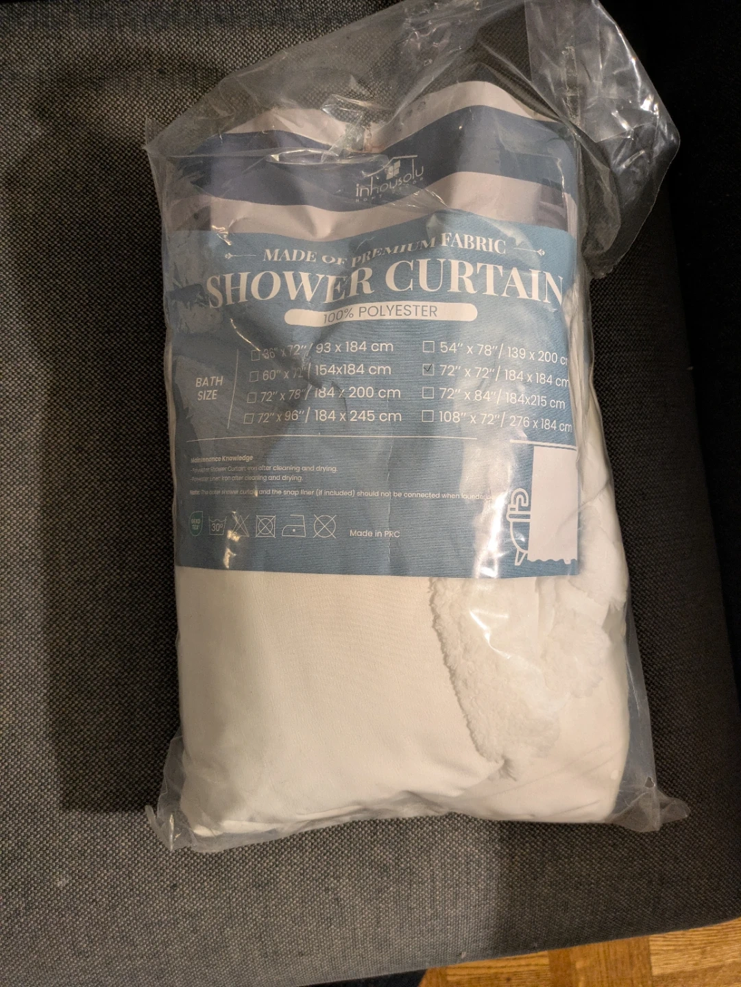 Premium white tufted polyester shower curtain with metal beaded hooks for easy open and closing. 72"x72" will fit most regular sized bath tubs. Washable. Opened but unused.