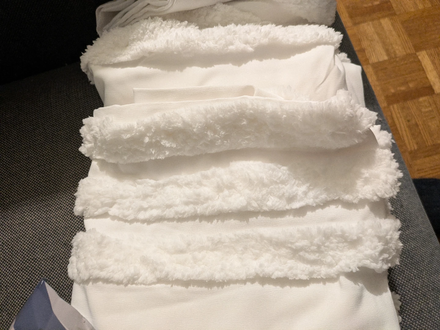 Premium white tufted polyester shower curtain with metal beaded hooks for easy open and closing. 72"x72" will fit most regular sized bath tubs. Washable. Opened but unused.