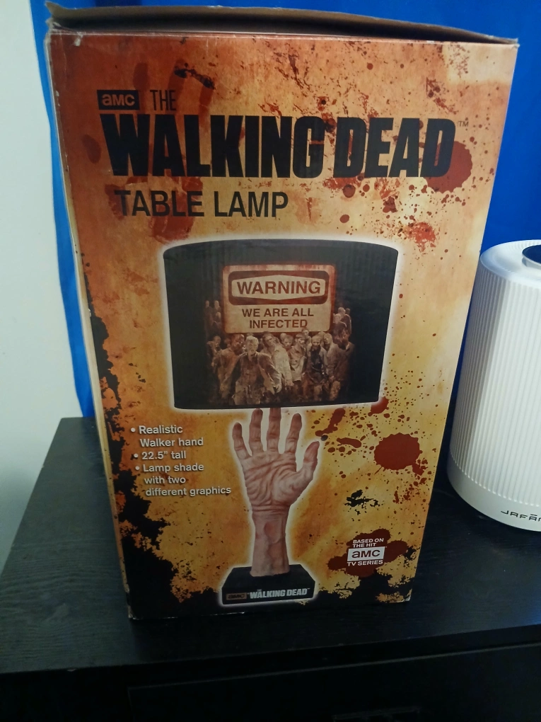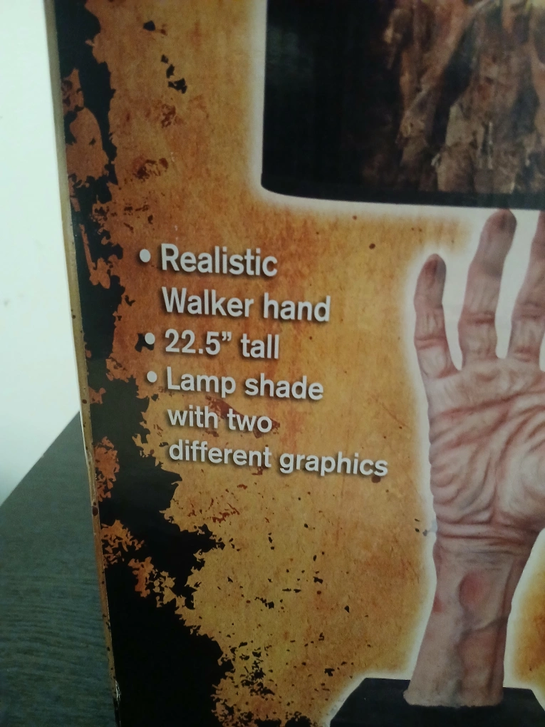 Officially licensed AMC The Walking Dead table lamp. Features a realistic walker hand and lampshade with two different graphics. 22.5 inches tall. New in box.