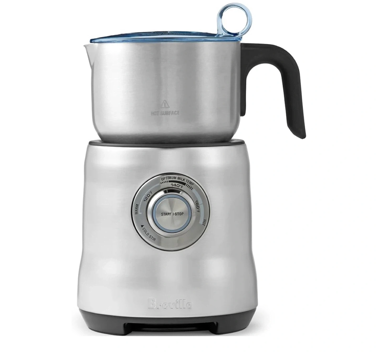 Breville Milk Cafe milk frother. It's great for making hot or cold milk foam for your favourite beverages. Includes multiple settings for temperature and milk texture. Stainless steel jug with a black handle. Comes with a blue lid.
