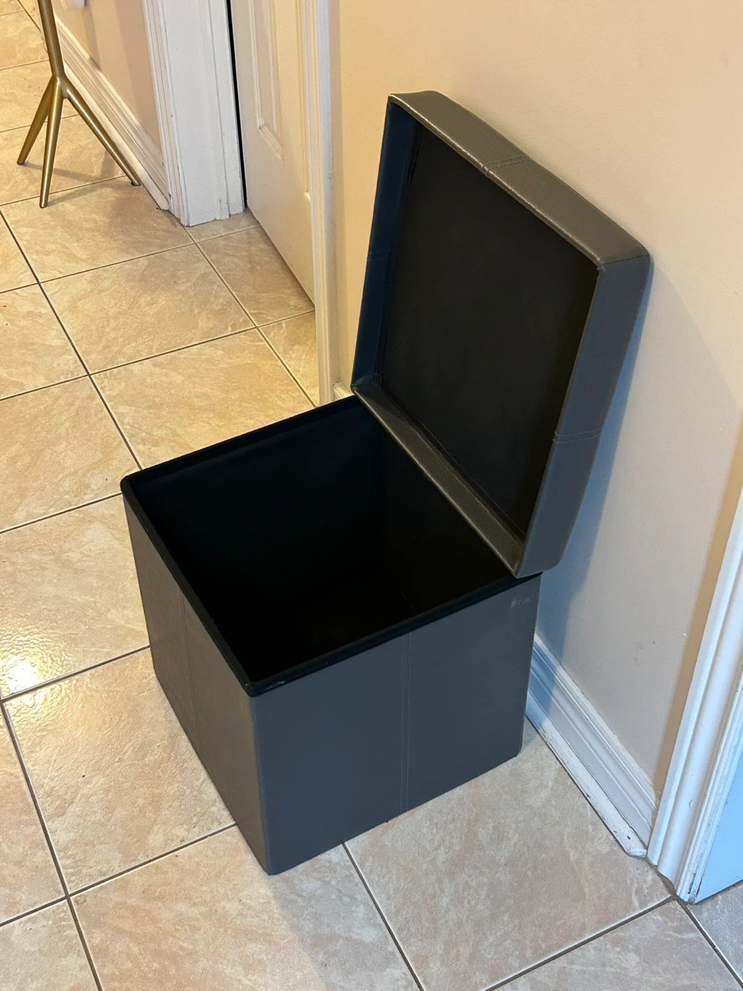This is a foldable storage ottoman in a dark grey faux leather. It's great for stashing blankets, toys, or other household items. It can also be used as extra seating or a footrest.
