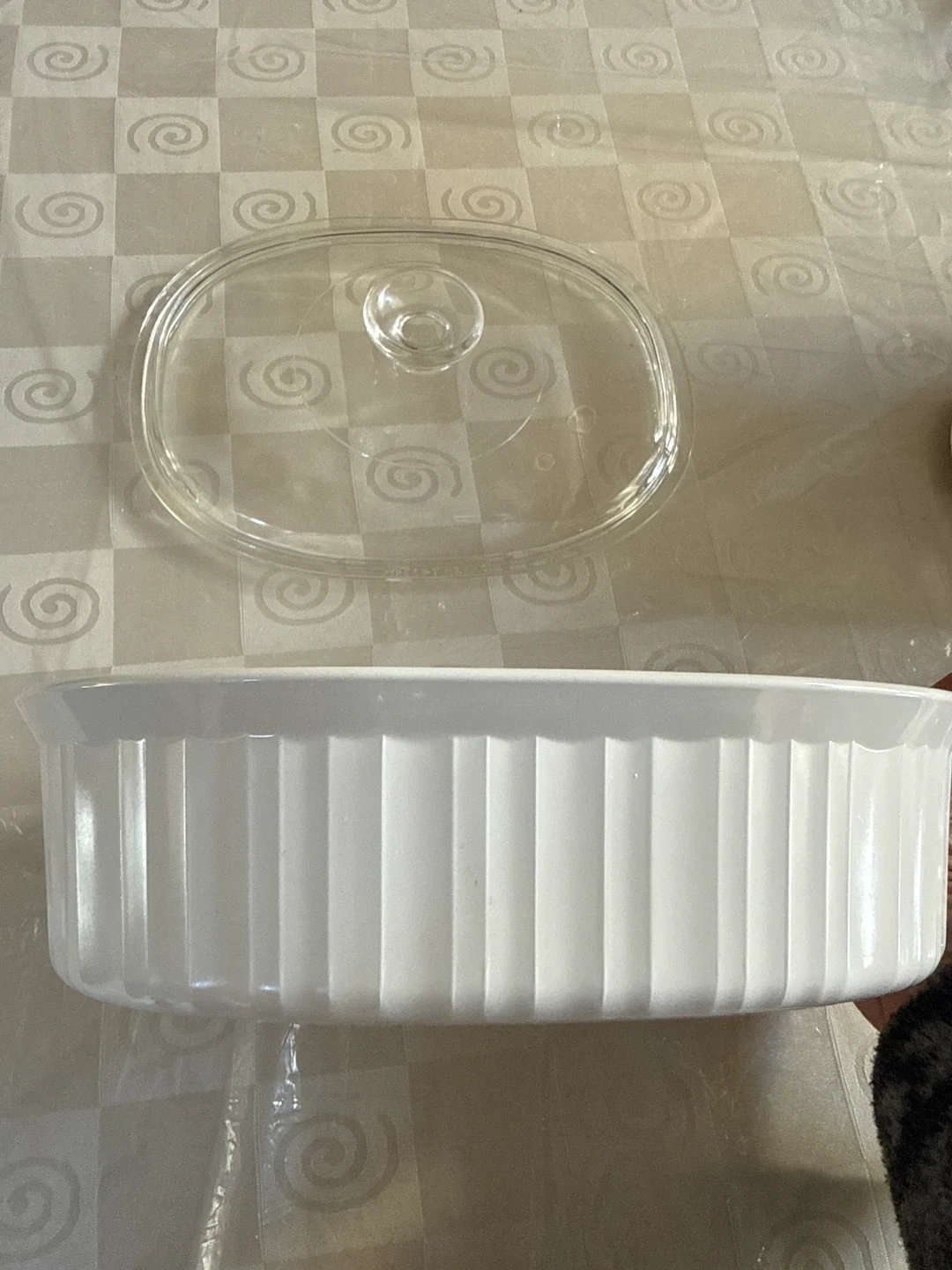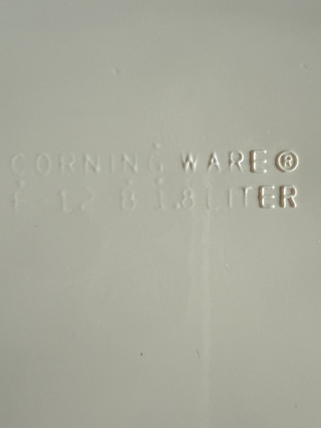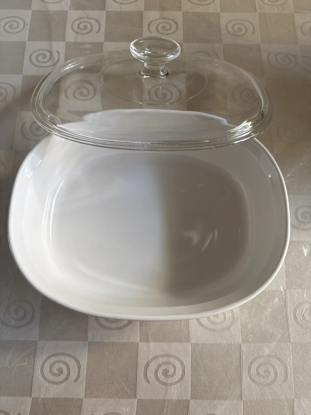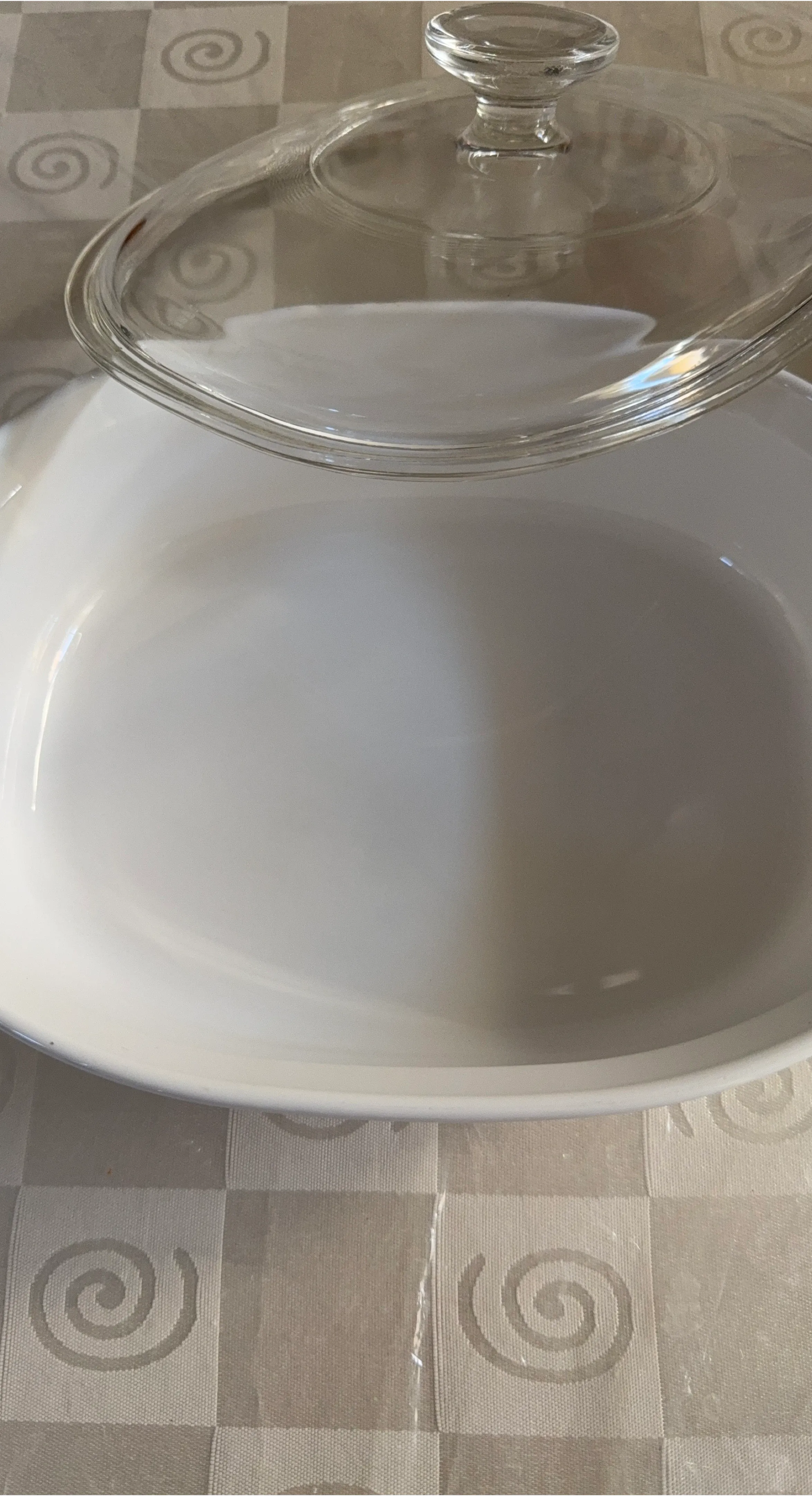 This is a CorningWare casserole dish with a Pyrex lid. It holds 1.8 liters. The dish is white and made of durable material. It's great for baking or serving food!