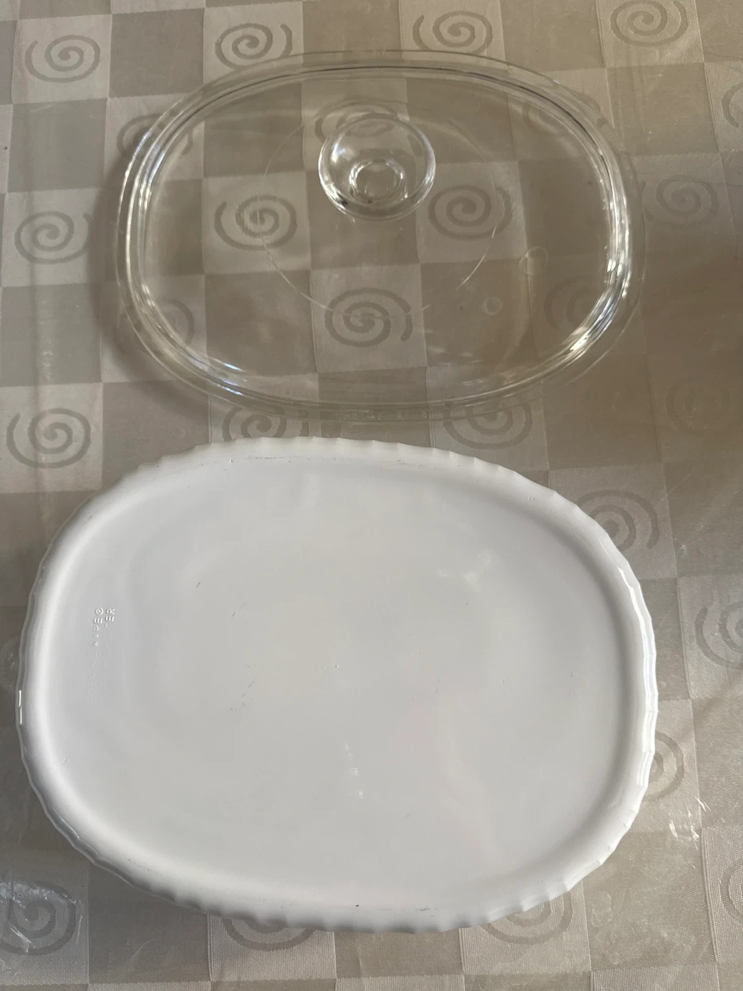 This is a CorningWare casserole dish with a Pyrex lid. It holds 1.8 liters. The dish is white and made of durable material. It's great for baking or serving food!