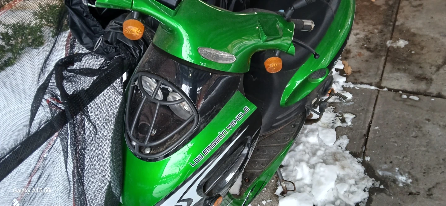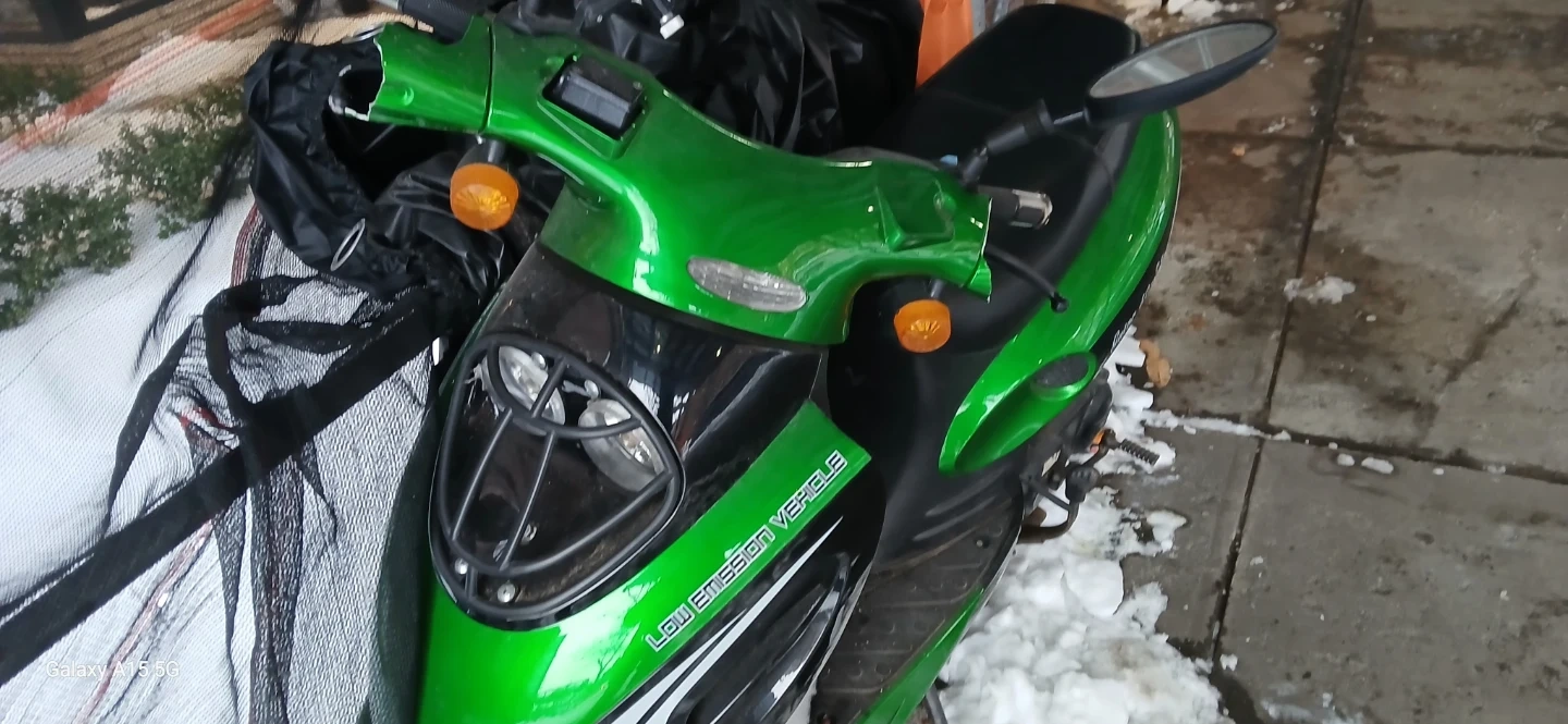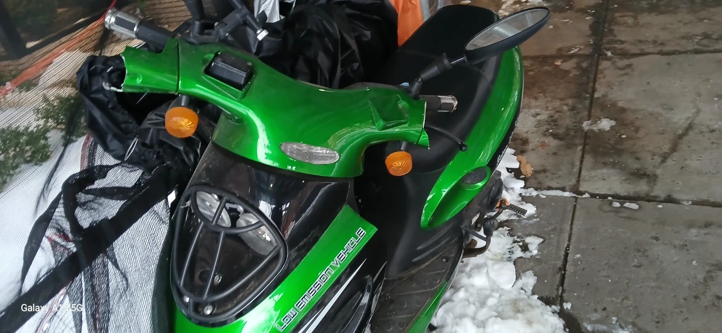This is a green scooter, labeled as a low emission vehicle. It has a black seat and mirrors. The body is bright green with black accents. Perfect for quick trips around town!