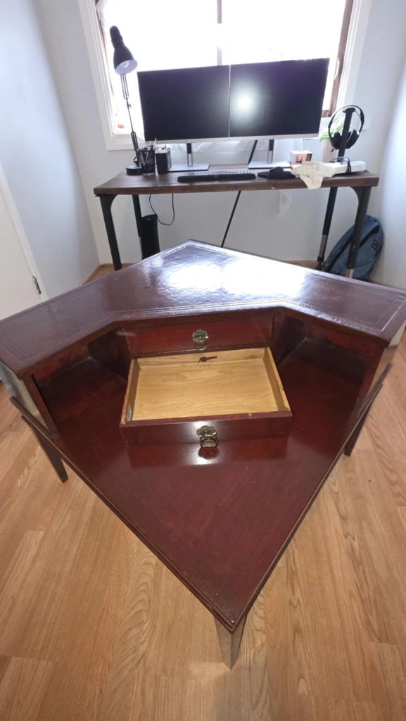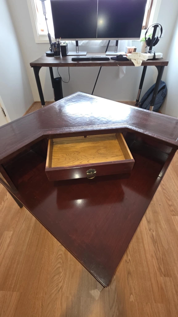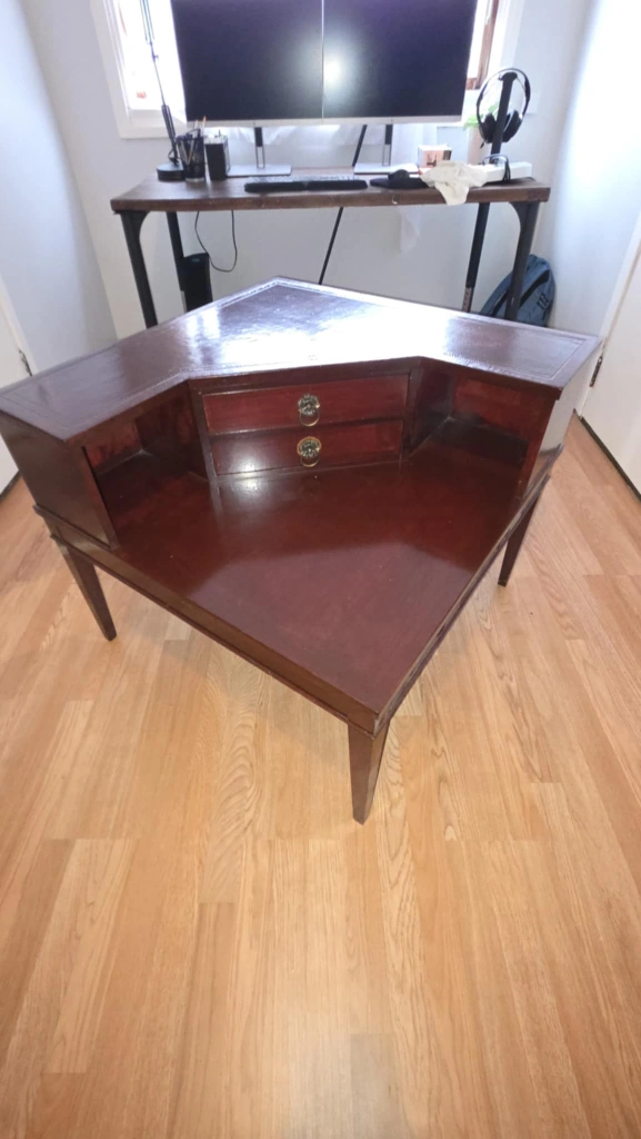 Corner desk with a glossy, reddish-brown finish. Features multiple drawers and a large surface area. A fine addition to any home office space. real wood piece. very sturdy.