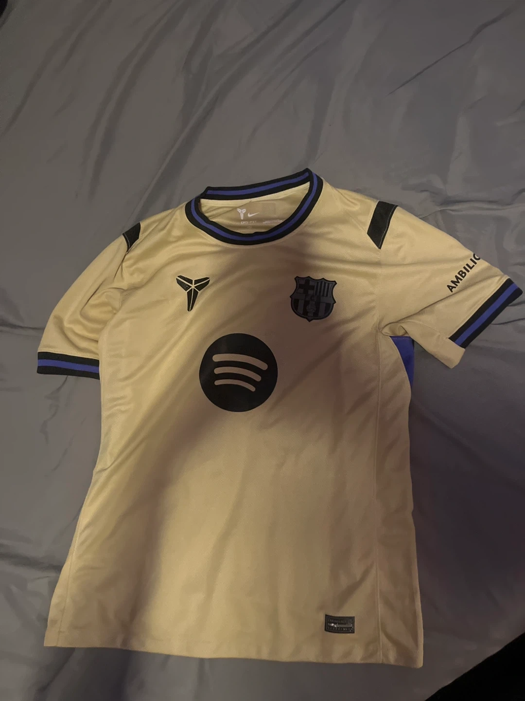 FC Barcelona jersey featuring Raphinha's name and number 11. It has the UNHCR ACNUR logo on the back and the Spotify logo on the front. This gold coloured jersey is short-sleeved with blue and black accents. Made with high-quality fabric for comfort and durability.