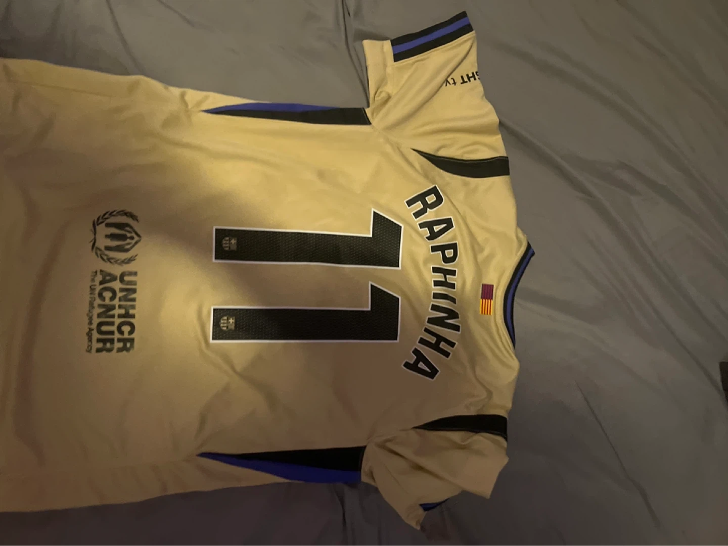 FC Barcelona jersey featuring Raphinha's name and number 11. It has the UNHCR ACNUR logo on the back and the Spotify logo on the front. This gold coloured jersey is short-sleeved with blue and black accents. Made with high-quality fabric for comfort and durability.