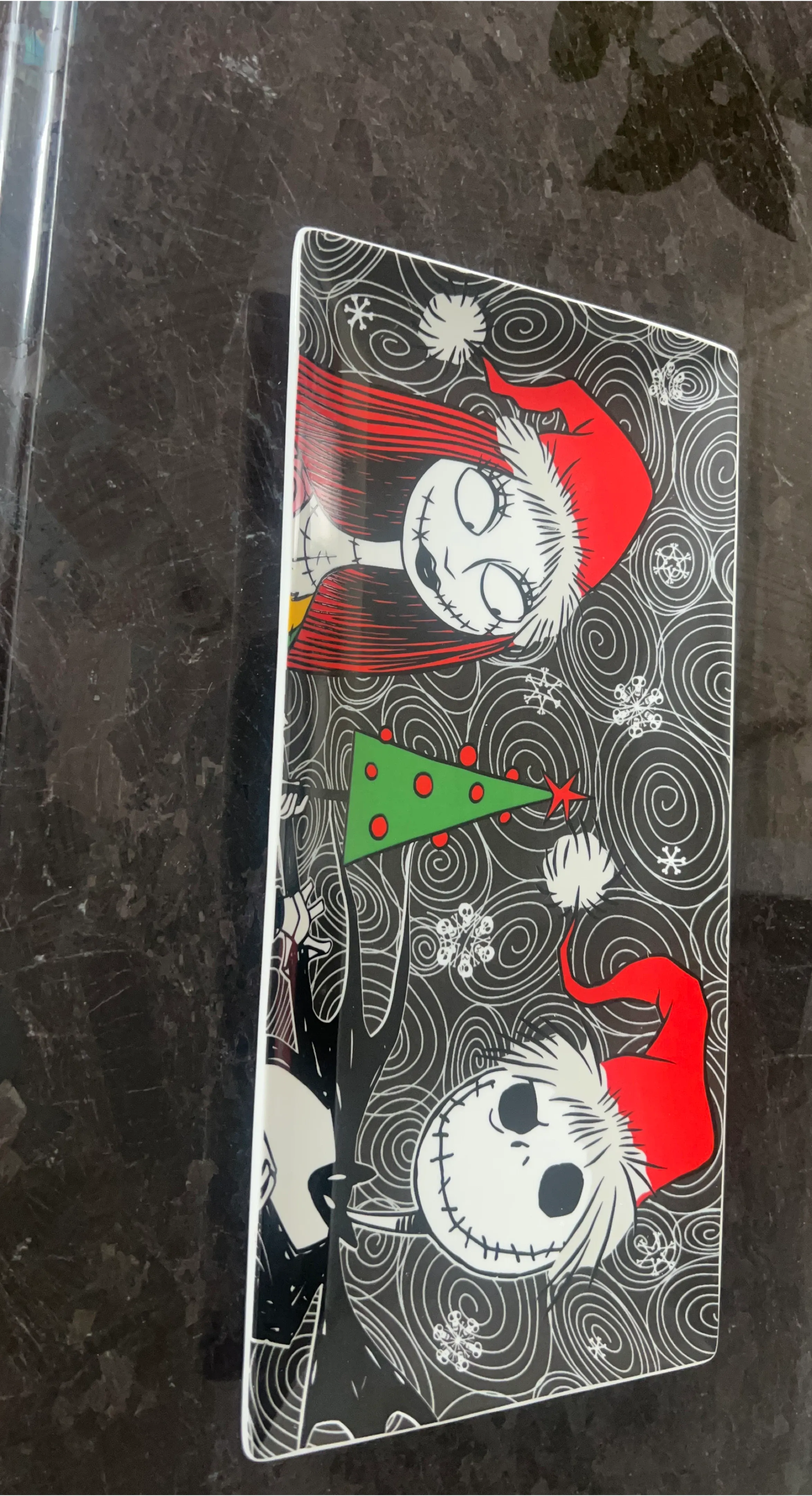 A festive serving platter featuring Jack Skellington and Sally in Santa hats. It has a black background with white swirl designs and snowflakes. Great for holiday gatherings!