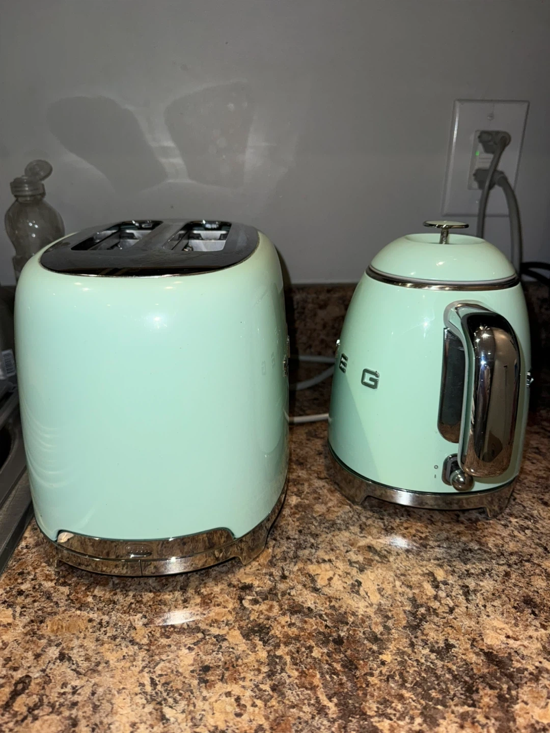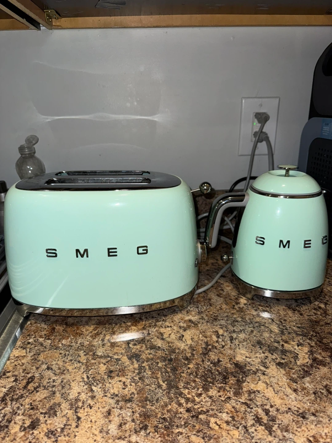 Matching light green Smeg kettle and toaster. Used but both in great condition. Toaster cord a little melted/ bent at the end (pictured) but hasn’t interfered with functionality.