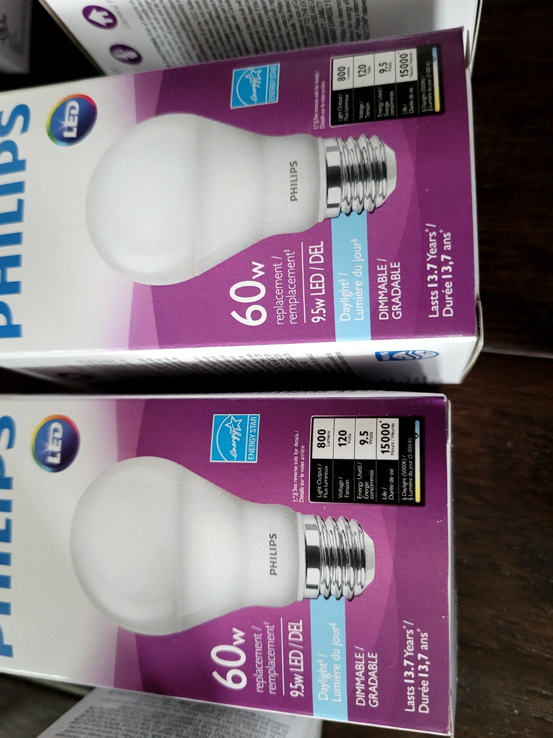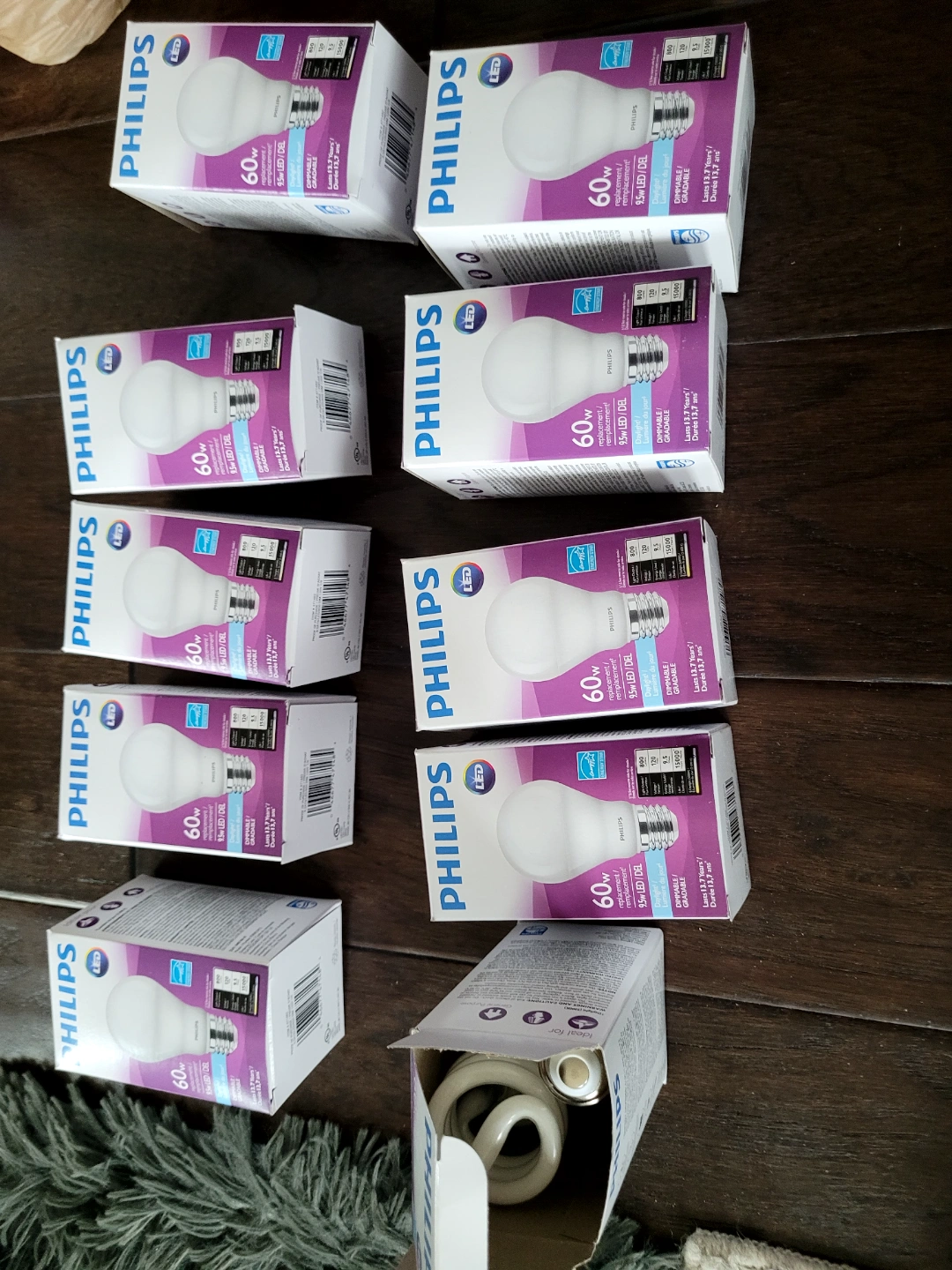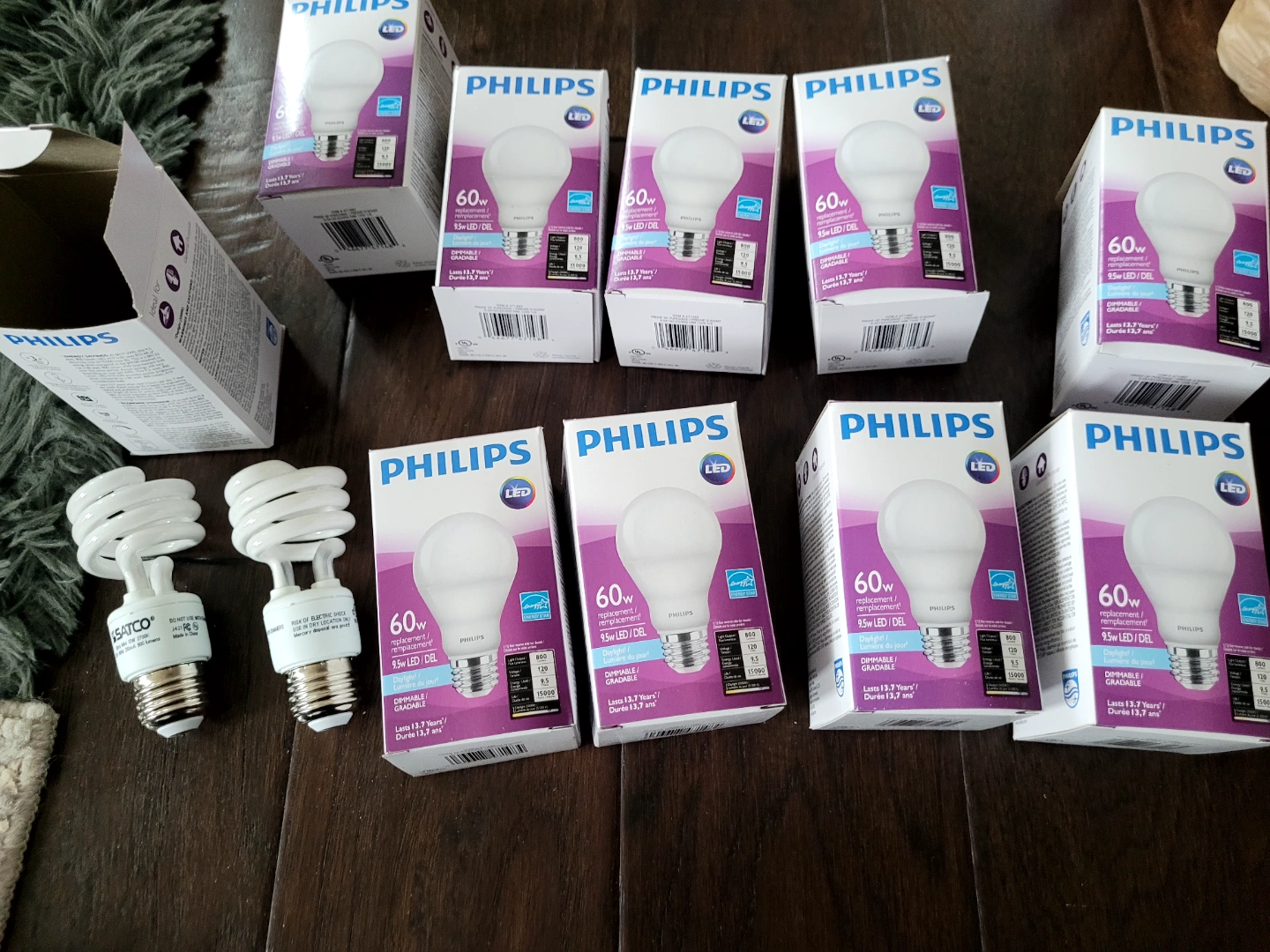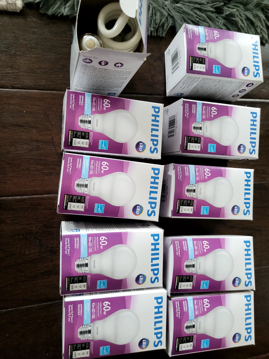 Ten new Philips 60w equivalent LED light bulbs. Two new CFL bulbs. All in original packaging. Energy efficient lighting solutions. 2 ct in 10 pk , 20 ct for $50