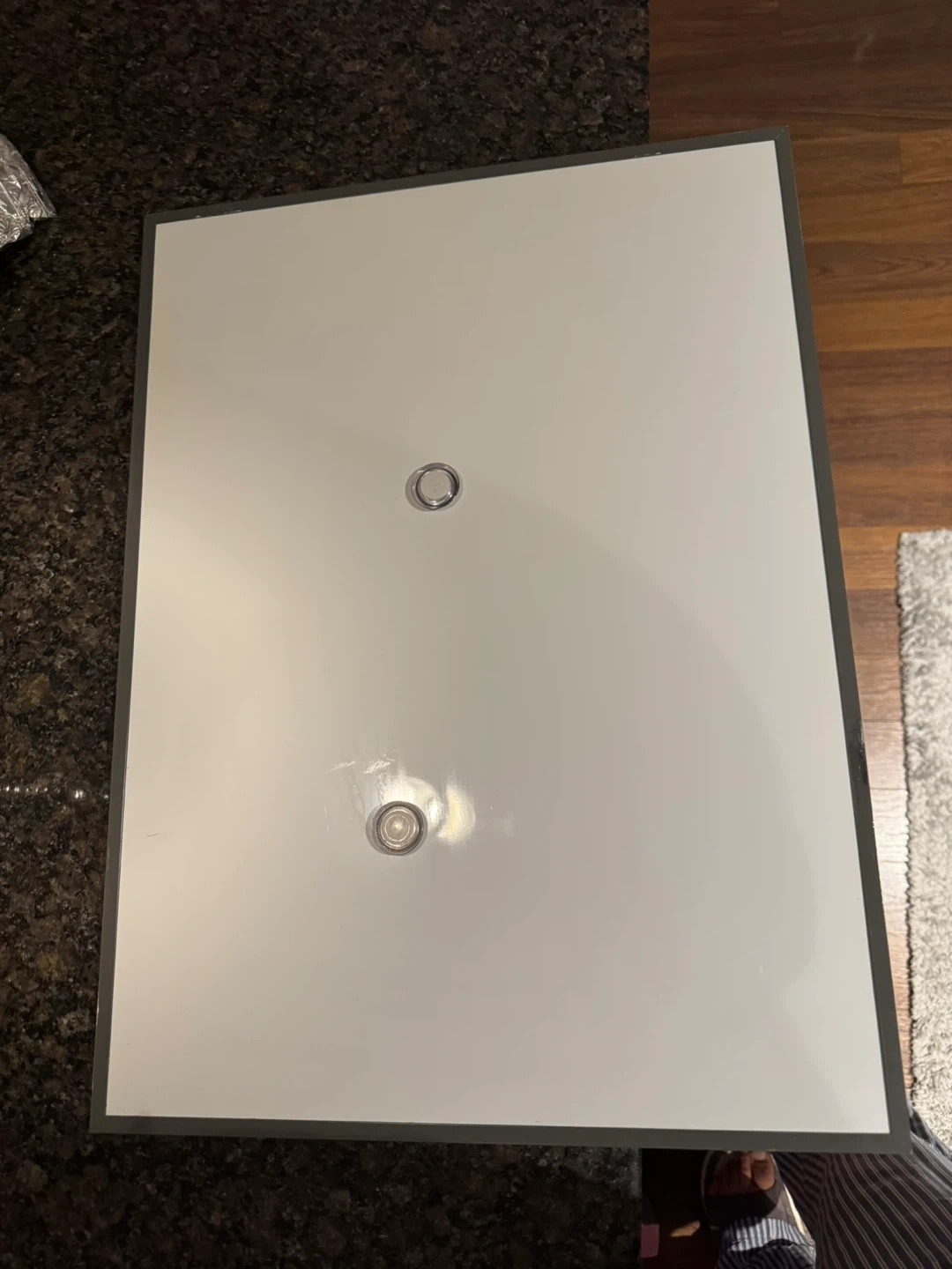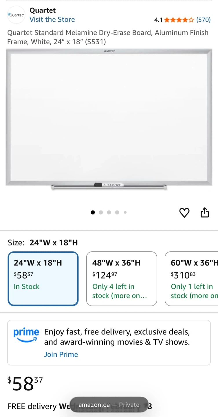 White dry-erase board with an aluminum finish frame. It's 24 inches wide and 18 inches tall. It has a smooth writing surface.