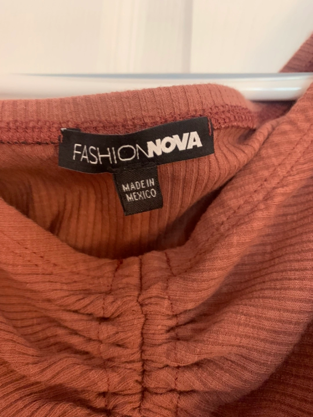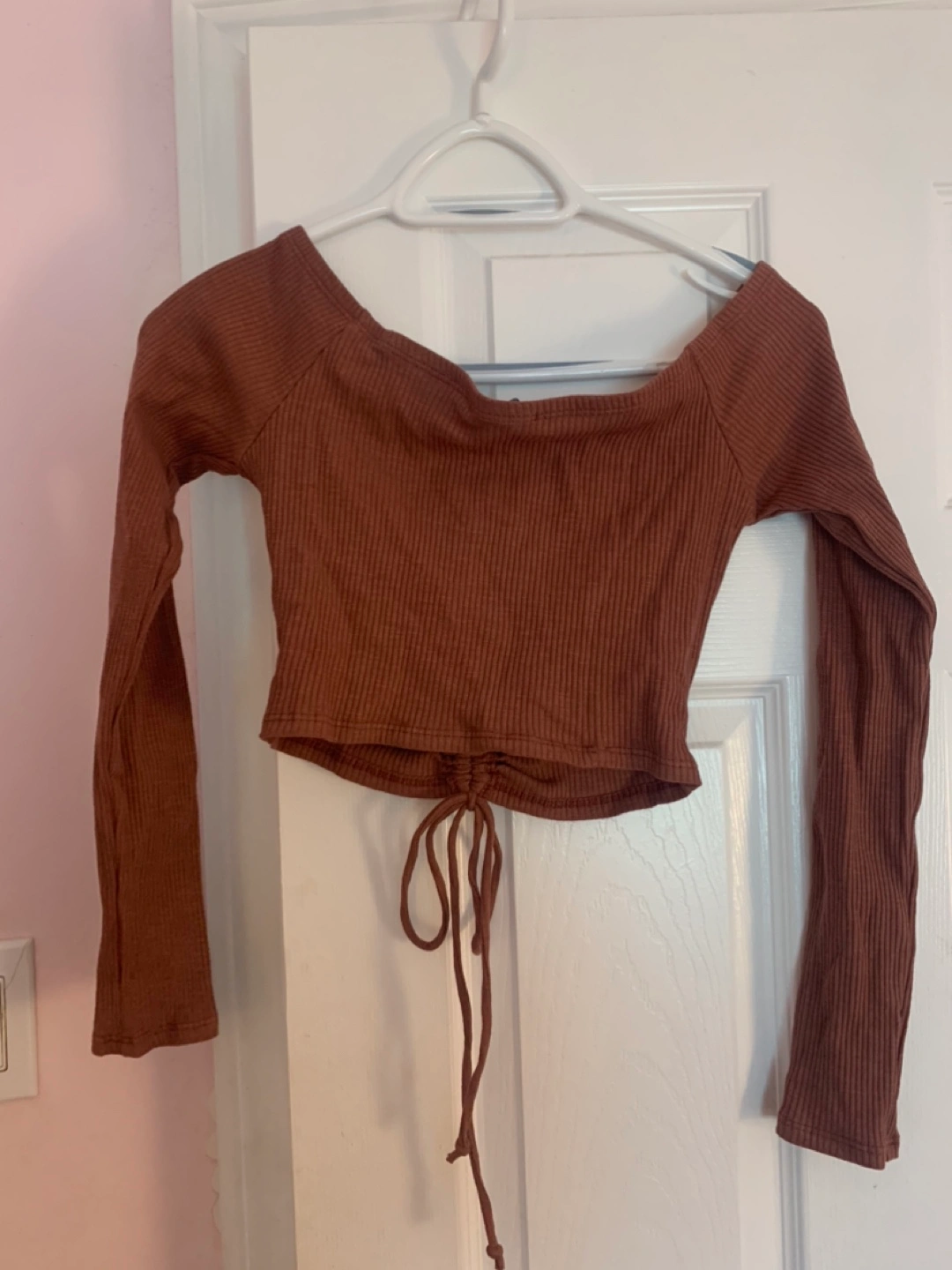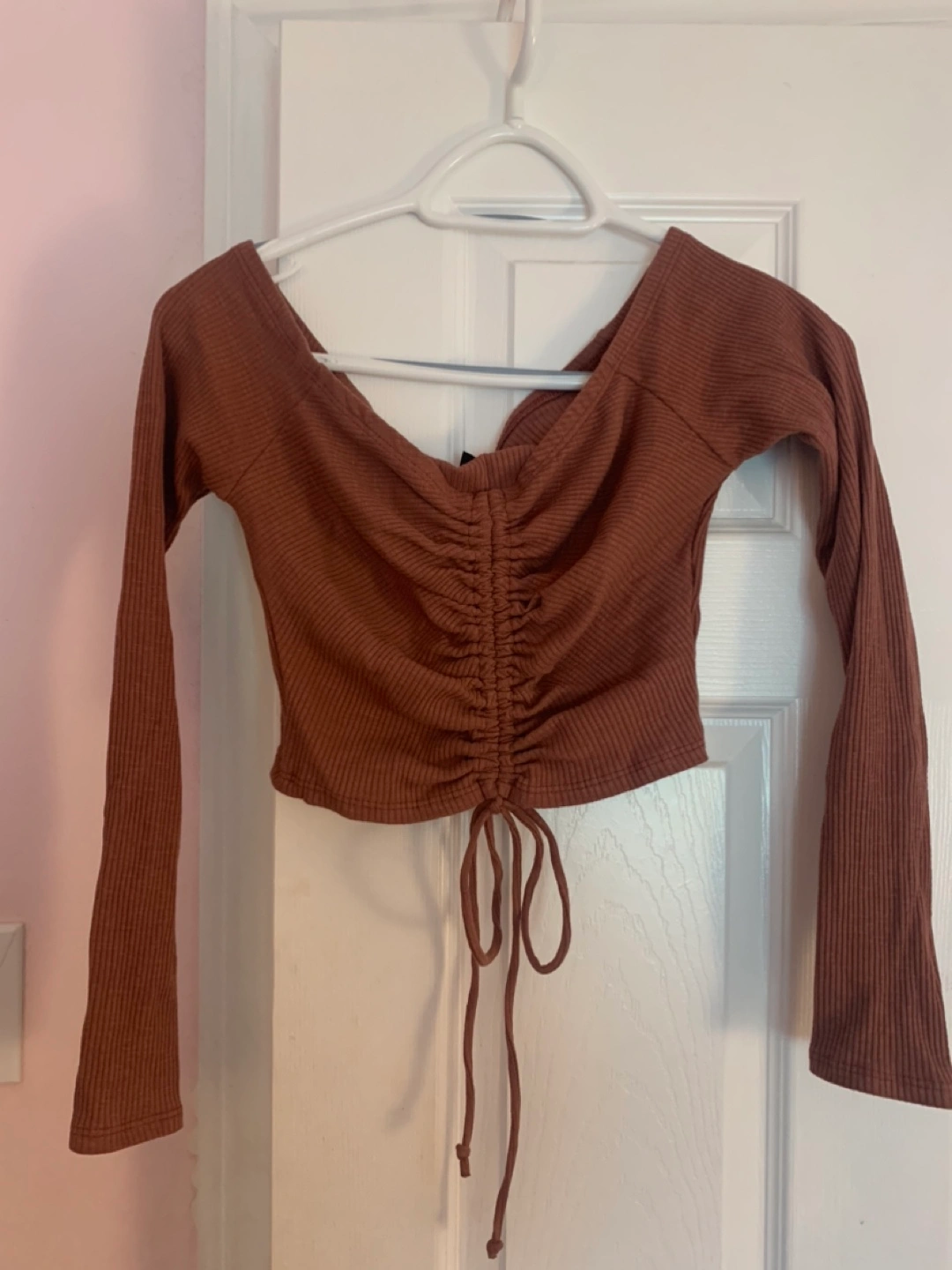 Selling a Fashion Nova long-sleeve top in a lovely brown colour! It's in great condition and would be a stylish addition to your wardrobe. The top features a unique drawstring detail. Let me know if you're interested or have any questions!
