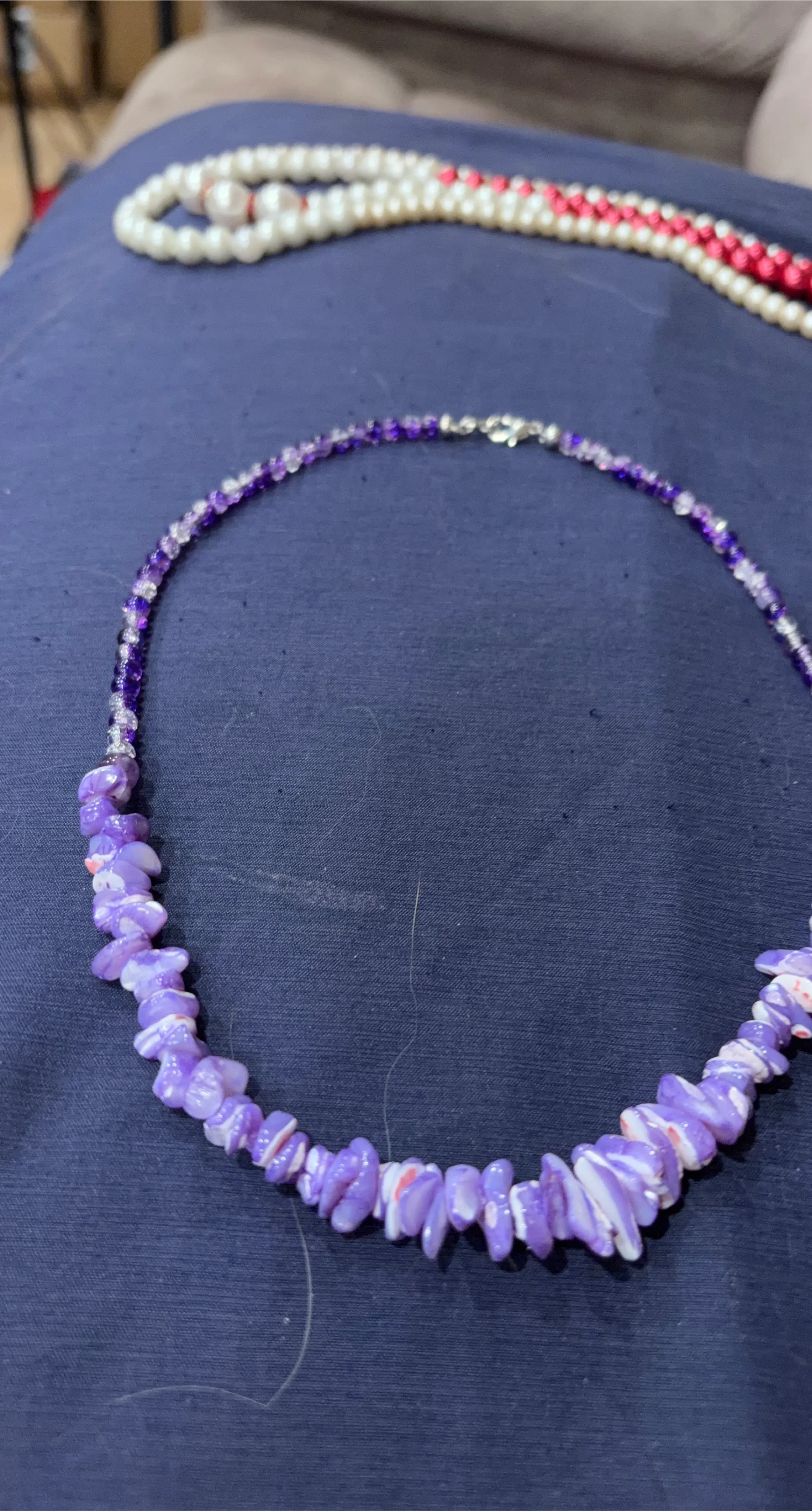 A lovely purple shell chip necklace with small purple and clear bead accents. It's about 18 inches long with a silver-toned clasp. This unique piece adds a pop of colour to any outfit!