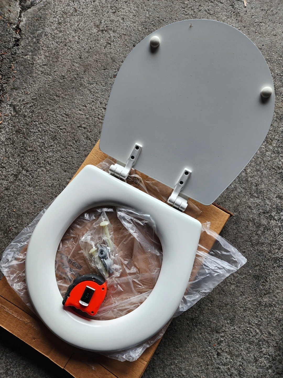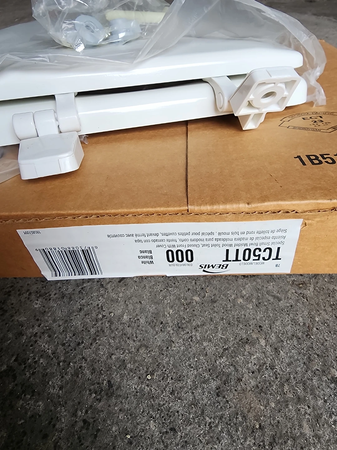 This is a Bemis TC50TT closed front toilet seat with a cover. It's white in colour and made of plastic. Includes mounting hardware. For infants use.