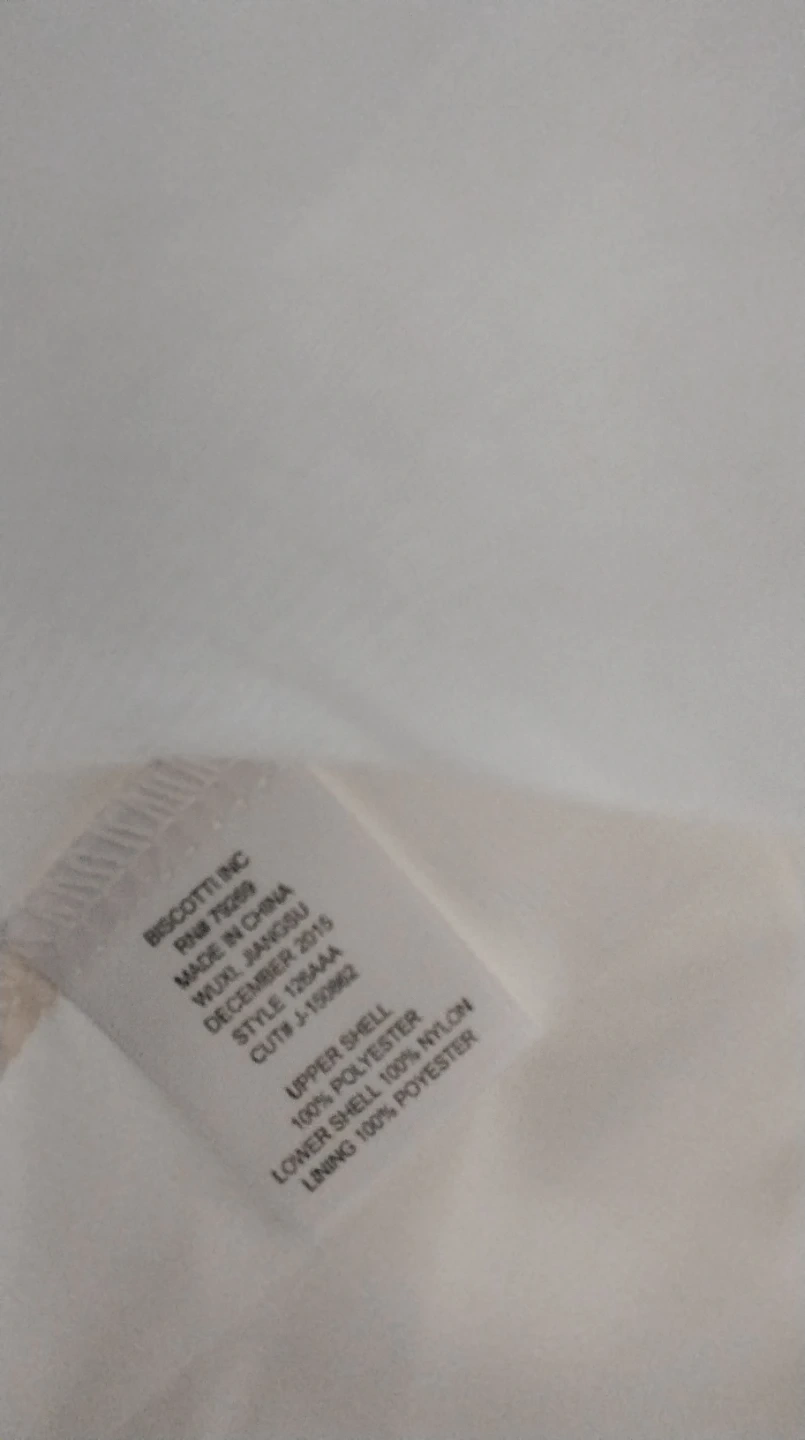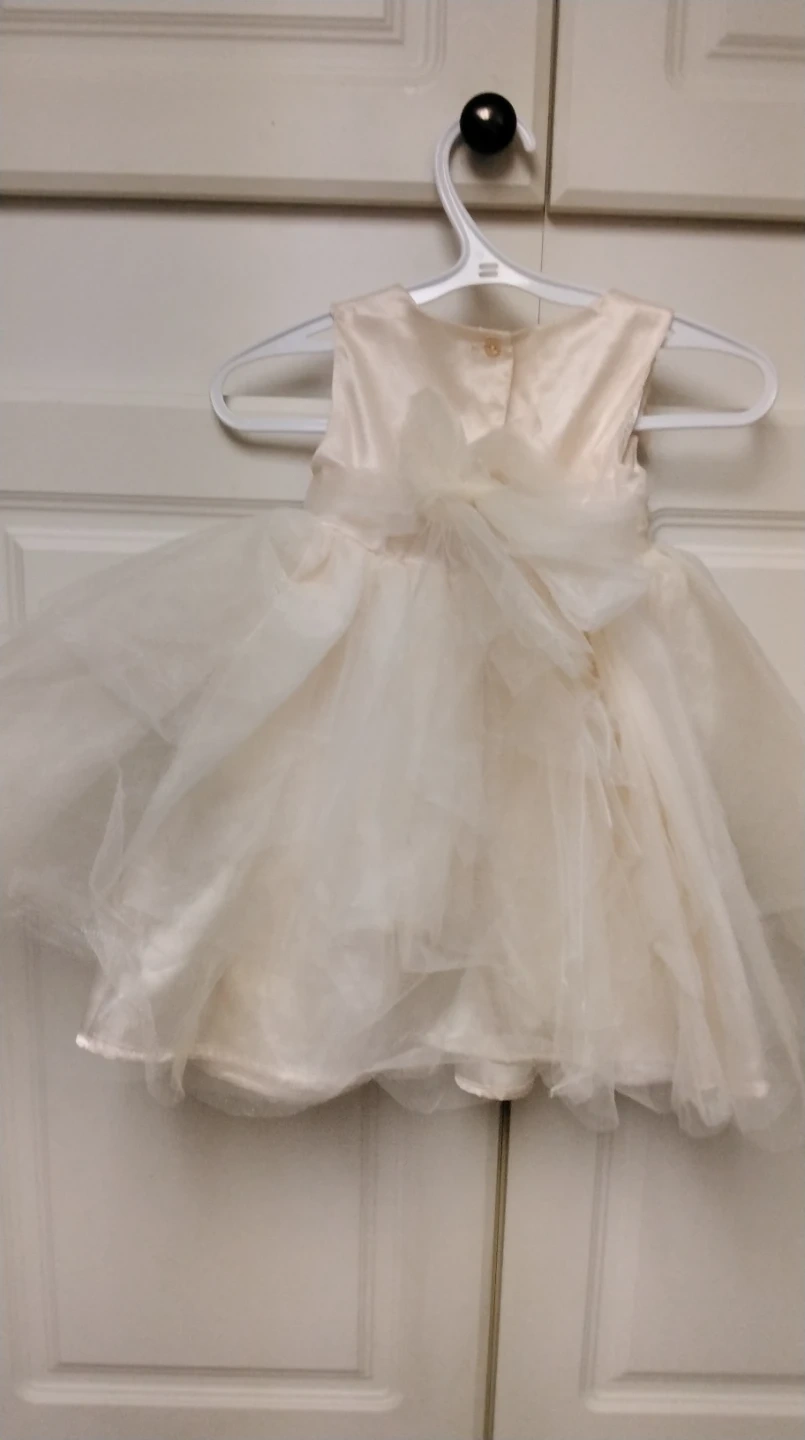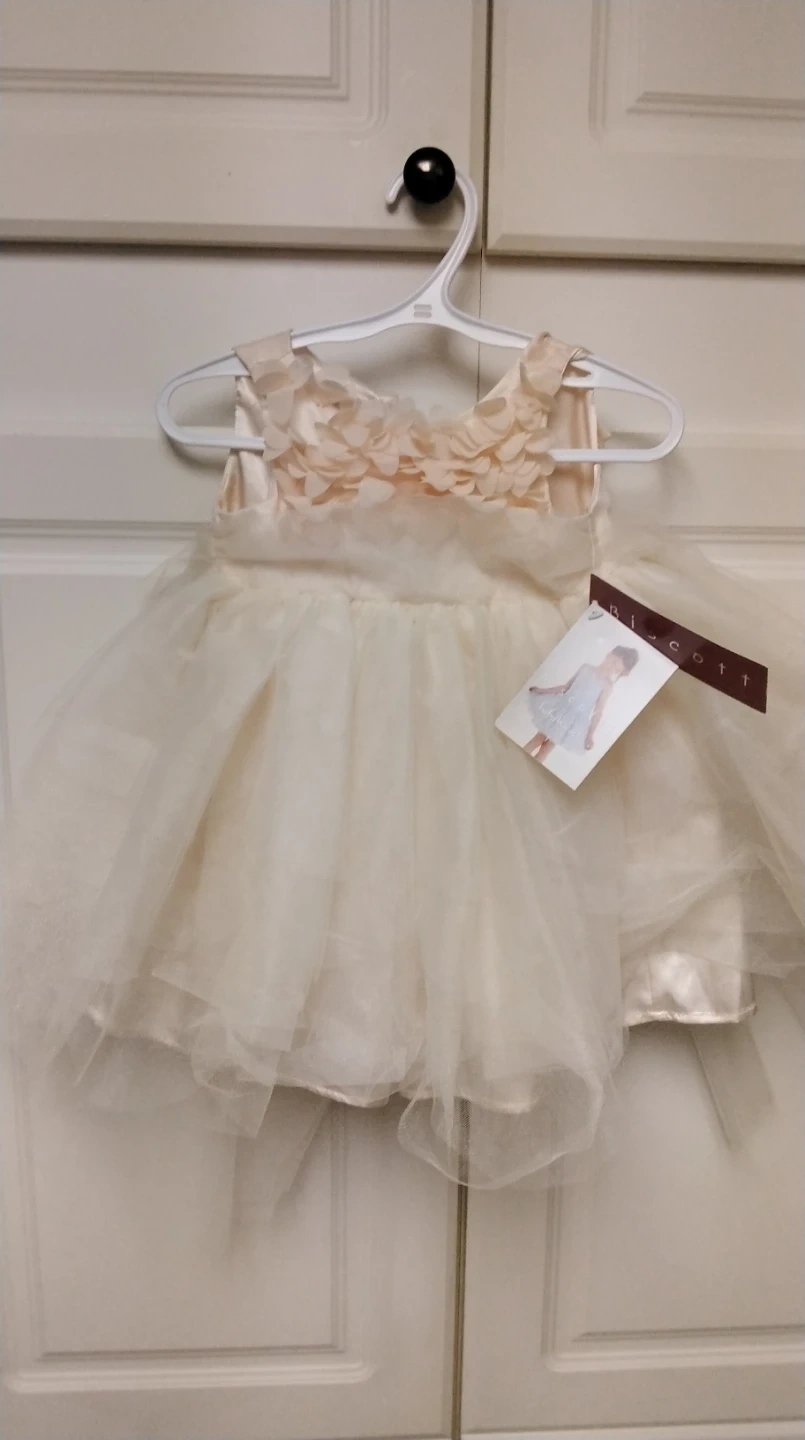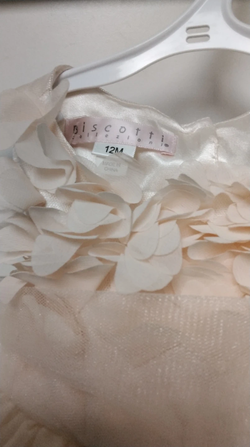 Cream coloured dress from Biscotti Collection. It's a size 12 months. Upper shell is 100% polyester, lower shell is 100% nylon, and the lining is 100% polyester. This dress would be lovely for a special occasion!