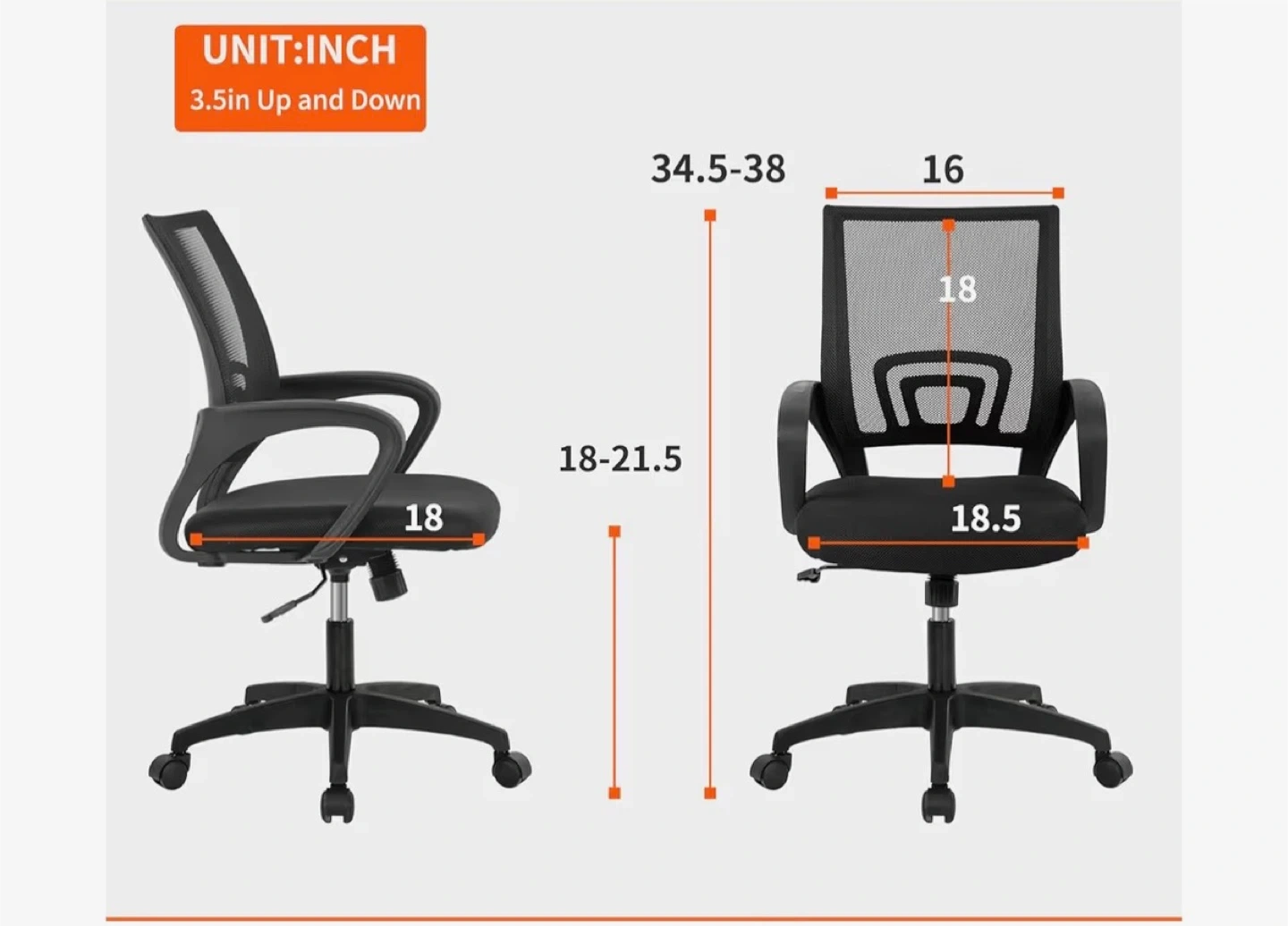 Selling a BestOffice ergonomic desk chair in black. It's in great shape and ready for a new workspace! The chair features a mesh back for breathability and lumbar support for extra comfort during long work sessions. Dimensions are shown in the picture.