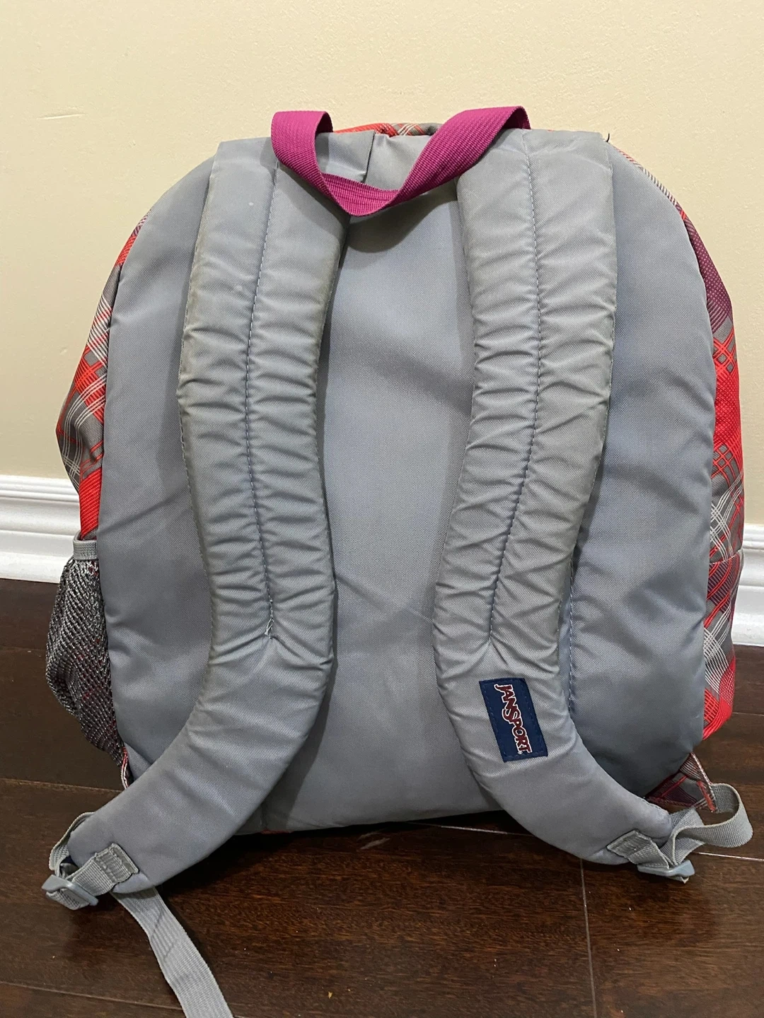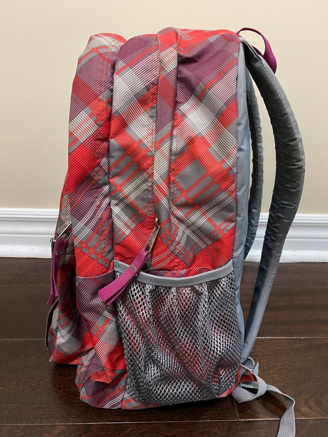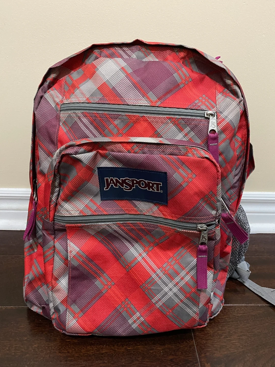 I'm selling a JanSport backpack in a red plaid pattern. It's in great condition and ready for a new owner! Perfect for school, travel, or everyday use.