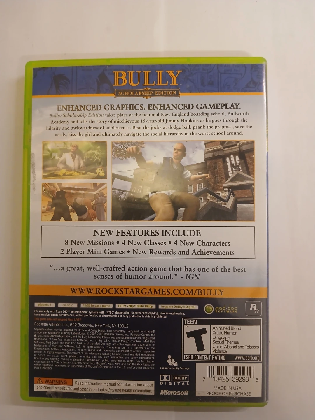 Bully Scholarship Edition for Xbox 360. This game includes 8 new missions, 4 new characters, and 2 player mini games. Features new rewards and achievements.