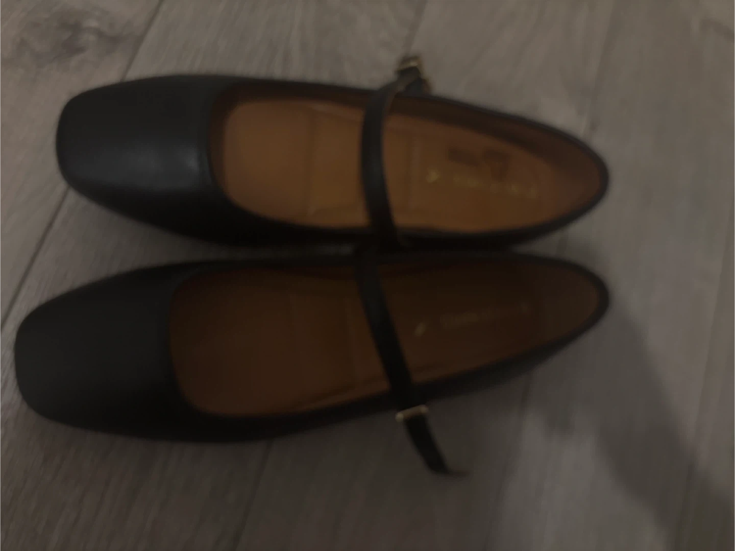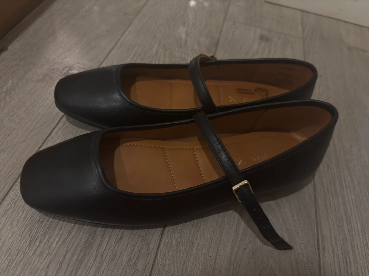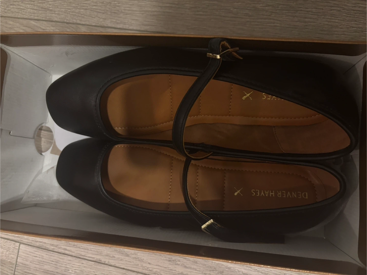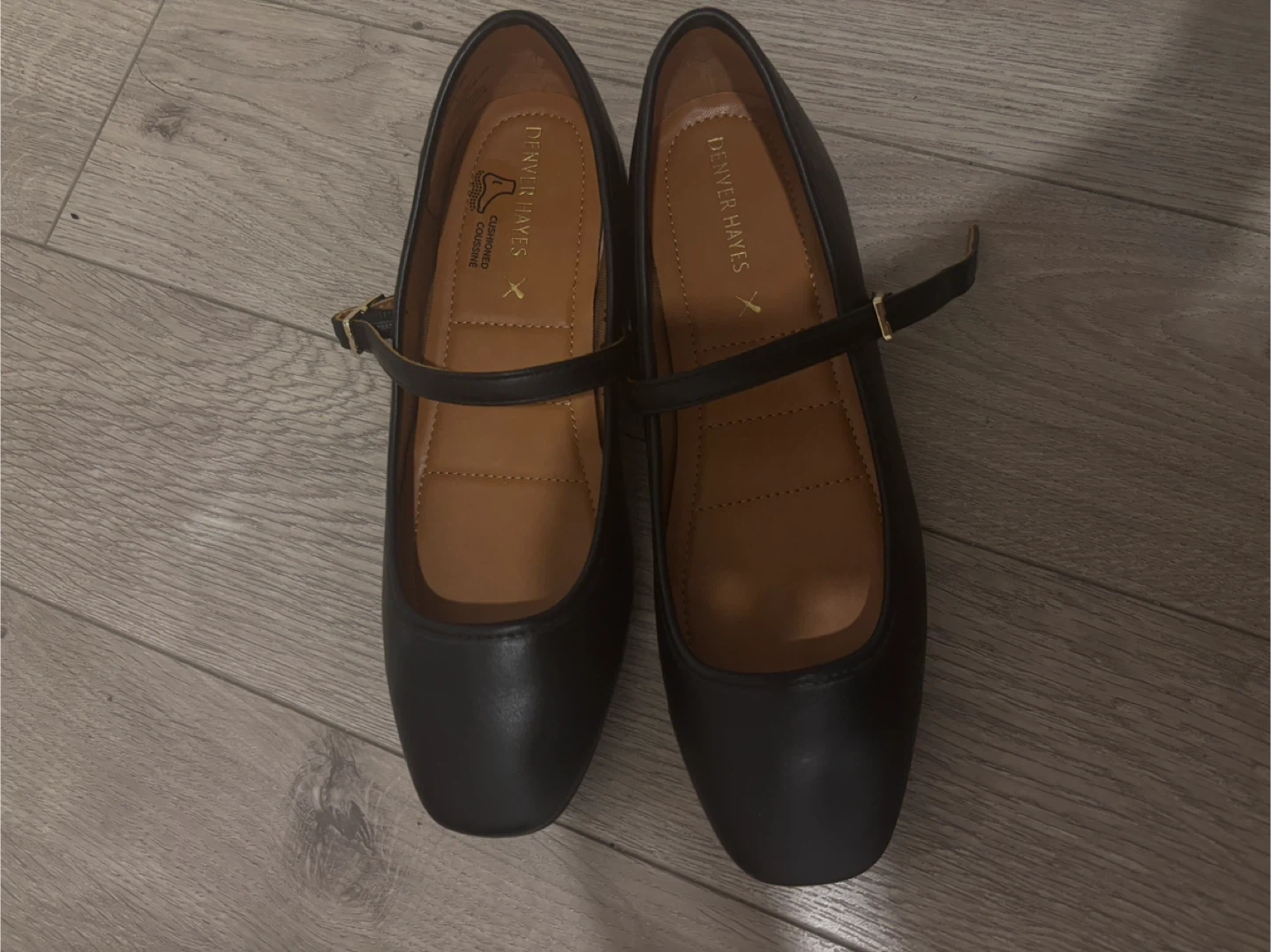 A pair of Denver Hayes black Mary Jane shoes with a strap and buckle. They're made with a synthetic upper and feature a cushioned insole. Includes original box.