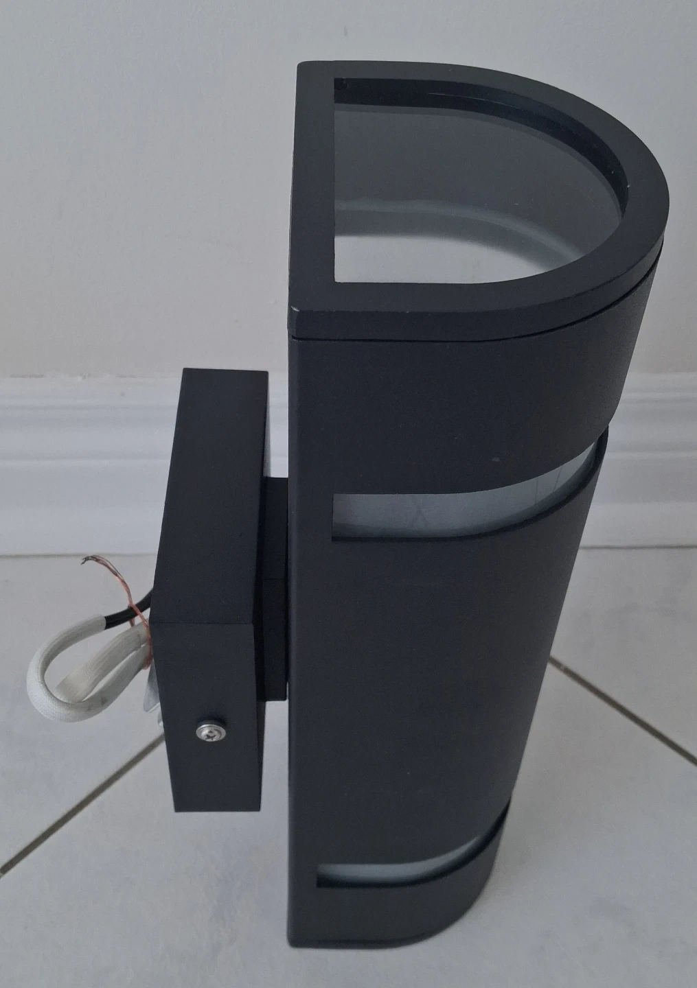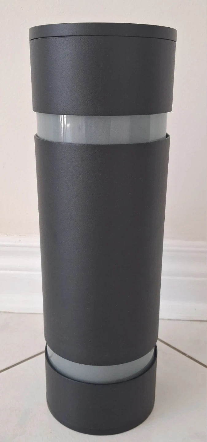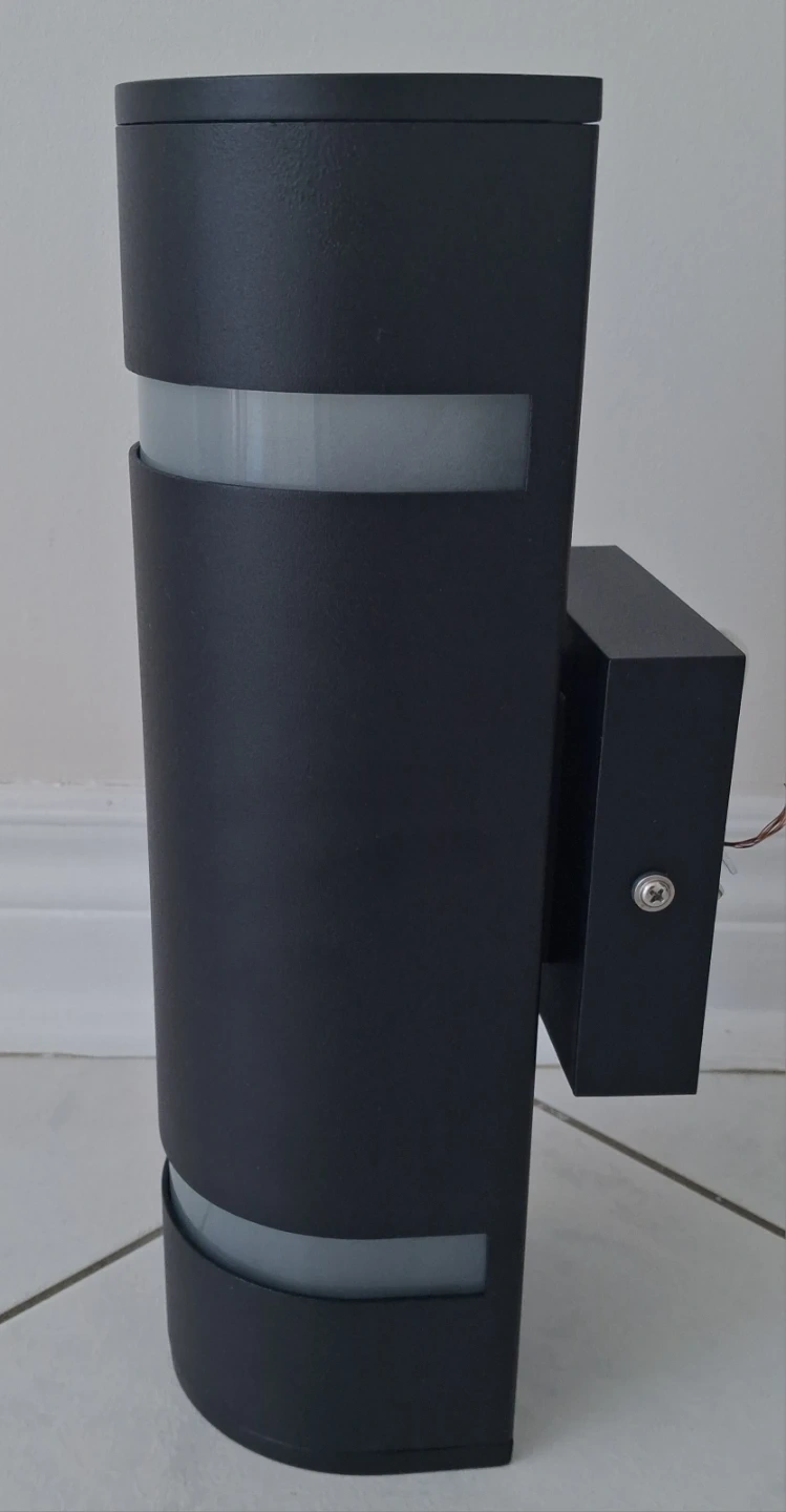 Modern outdoor and indoor wall-mounted light fixture. It's made of stainless steel and aluminum with a 3-way stream light. Weather resistant with a maximum of 100W type T bulbs required. Dimensions are 33 cm H x 10.8 cm W x 13.3 cm D.