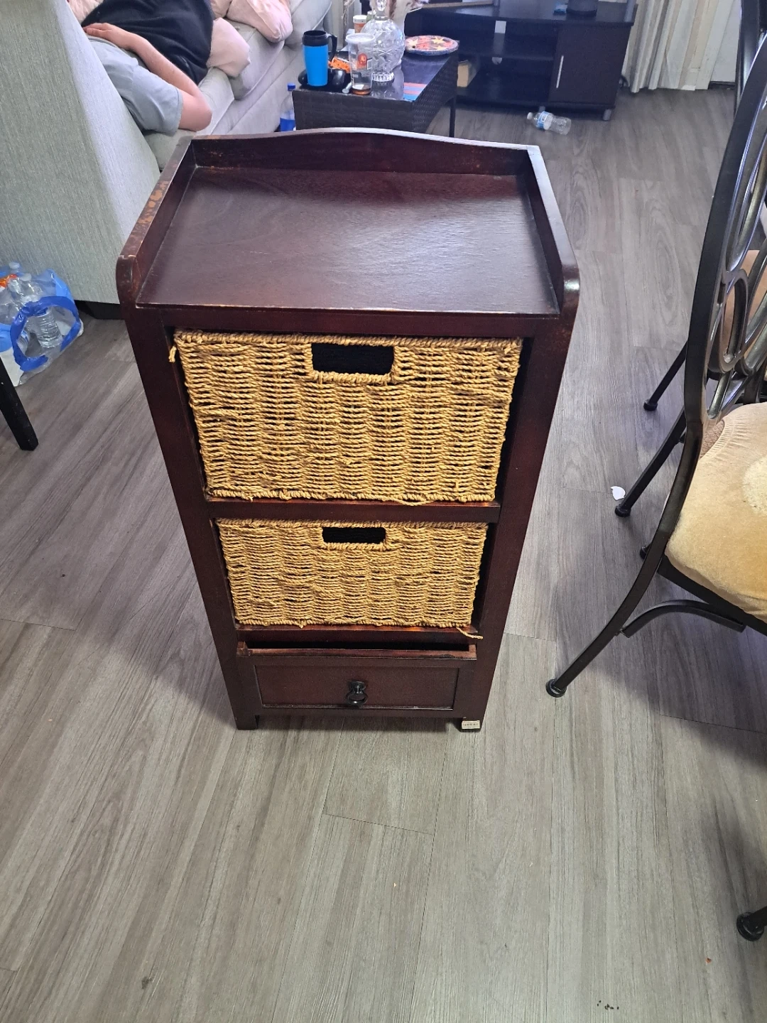 This dark wood side table features two woven wicker baskets for storage. It also has a small drawer at the bottom. The top surface is flat and has a slight lip. It's a compact piece, great for small spaces!