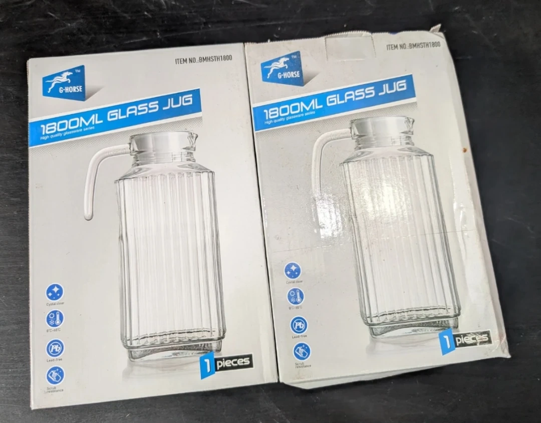 I have 2 brand new G-Horse 1800ML glass jugs still in their boxes! It's a high-quality glassware piece that's crystal clear and lead-free. It's also suitable for temperatures between 8°C-40°C.