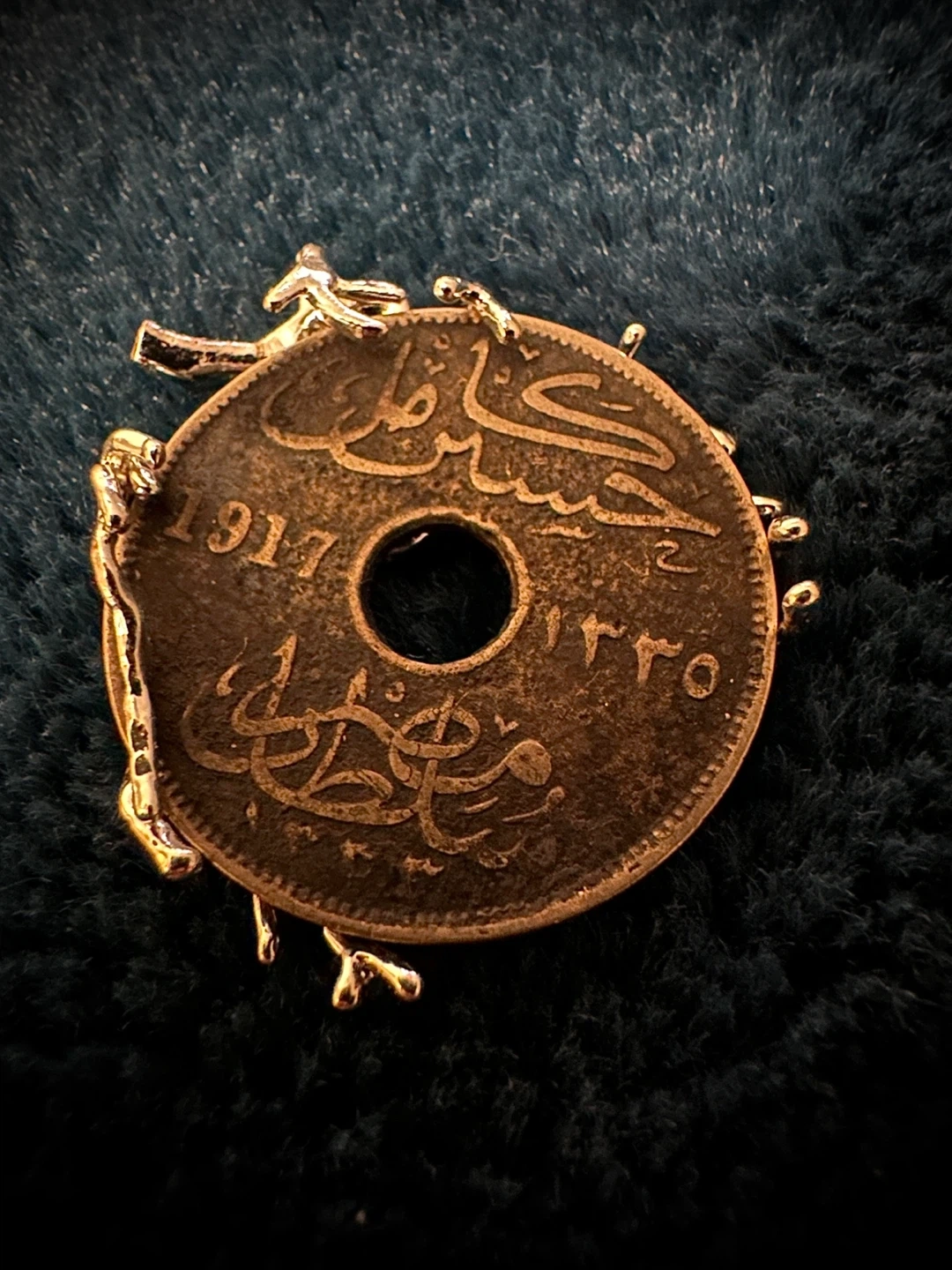 This is a unique pendant made from a 1917 coin. It's adorned with gold-tone metal elements, resembling tiny figures. The coin features Arabic script and a central hole. It's a distinctive piece for collectors or as a statement accessory.