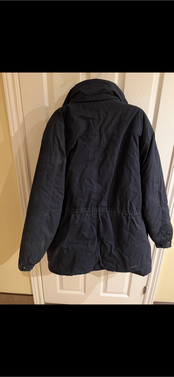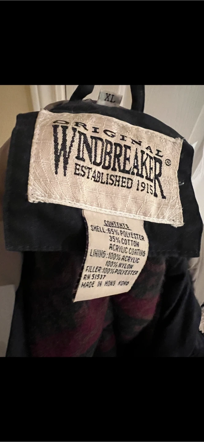 This is an Original Windbreaker jacket in size XL. Shell is 65% polyester and 35% cotton with an acrylic coating. The lining is 100% nylon and the filler is 100% polyester. It's made in Hong Kong.