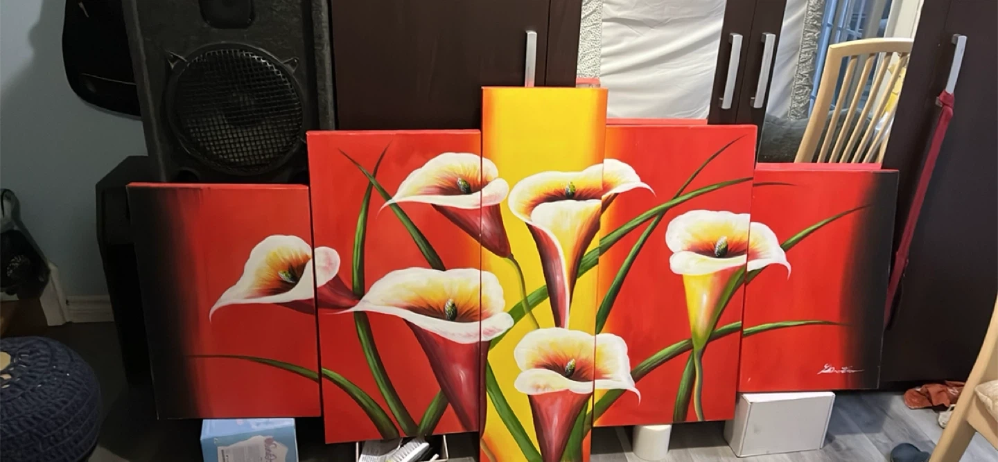 Selling a vibrant 5-panel canvas wall art set featuring a beautiful floral design. The artwork is in great condition and ready to brighten up any room in your home!