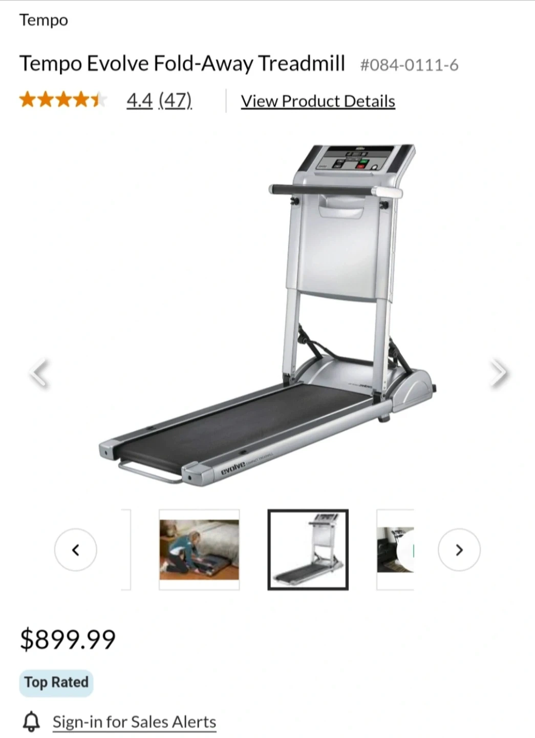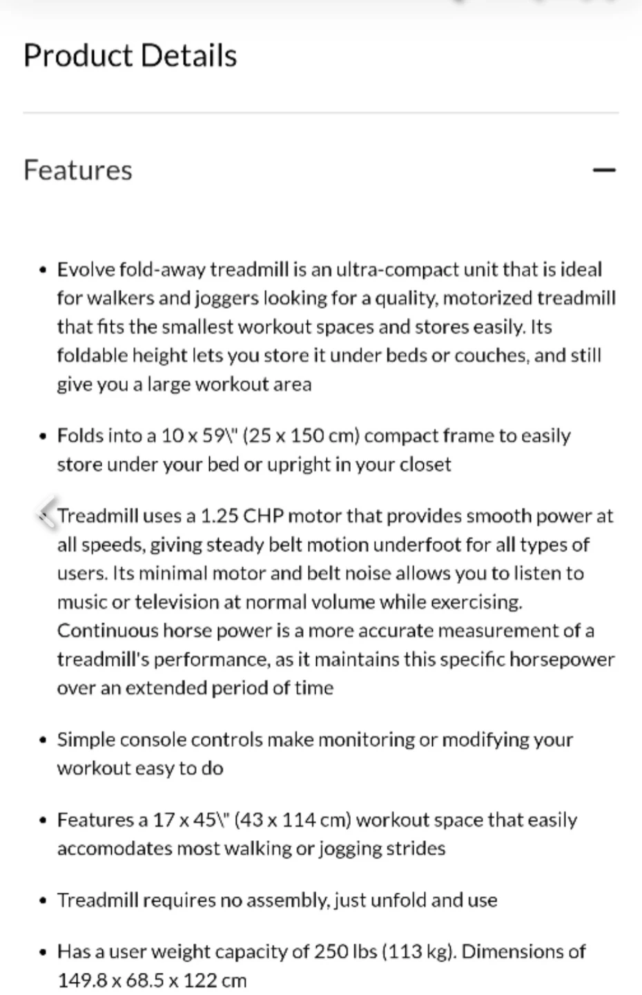 Tempo Evolve fold-away treadmill is an ultra-compact unit that fits the smallest workout spaces. It folds into a 10 x 59" compact frame for easy under-bed or closet storage. Treadmill uses a 1.25 CHP motor for smooth power at all speeds.