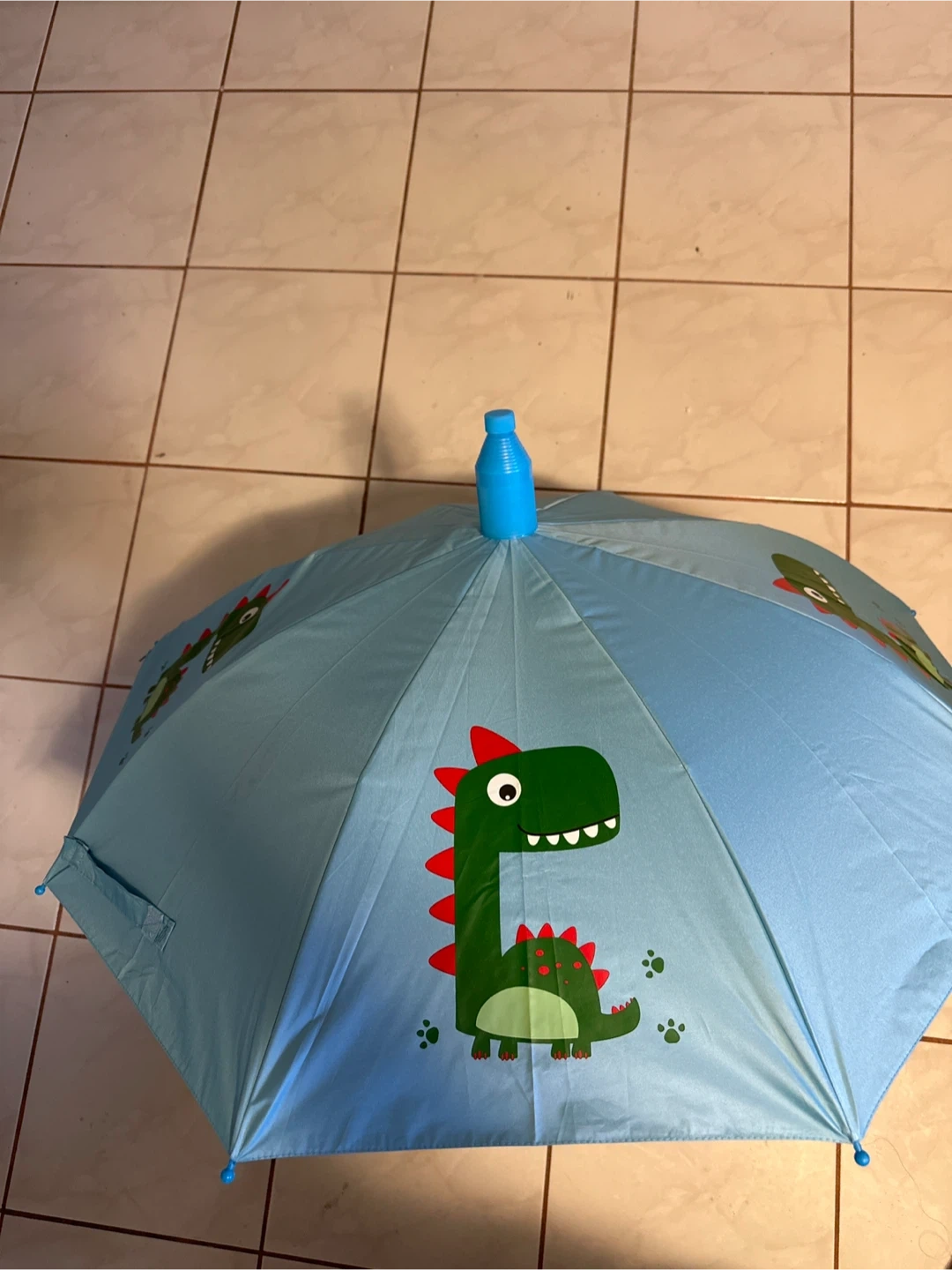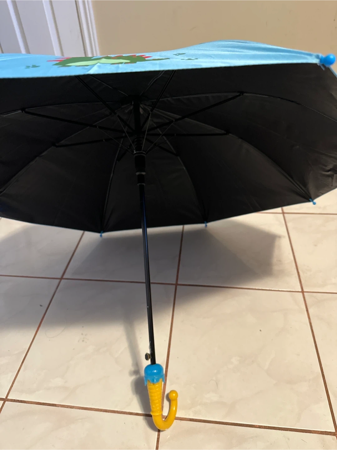 A cute blue umbrella for kids with a green dinosaur design. It's perfect for keeping dry on rainy days. Features a sturdy frame and a child-friendly handle.