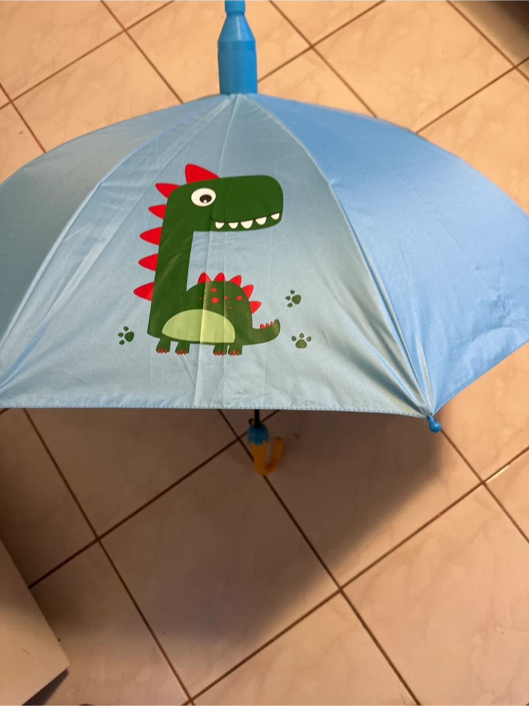 A cute blue umbrella for kids with a green dinosaur design. It's perfect for keeping dry on rainy days. Features a sturdy frame and a child-friendly handle.