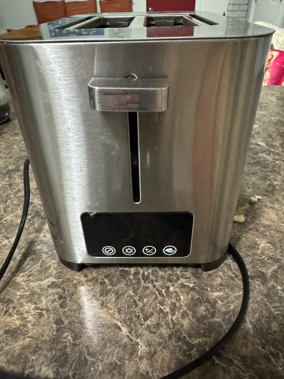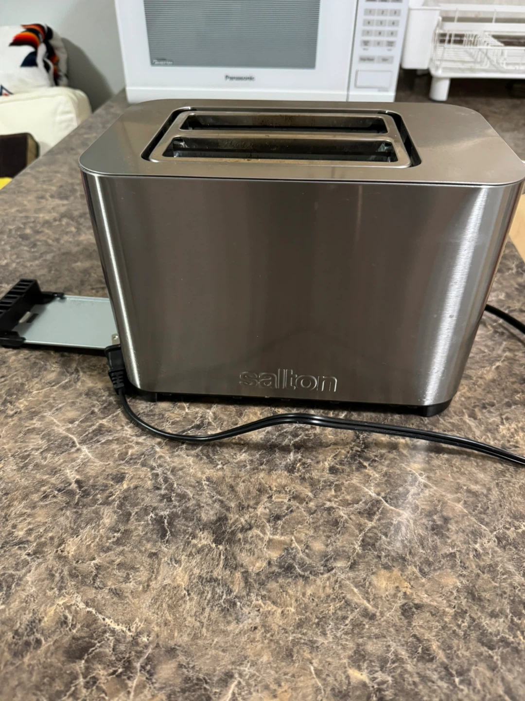 This Salton toaster has a brushed stainless steel finish and two slots for bread. It features a crumb tray for easy cleaning. Simple to use for your morning toast!