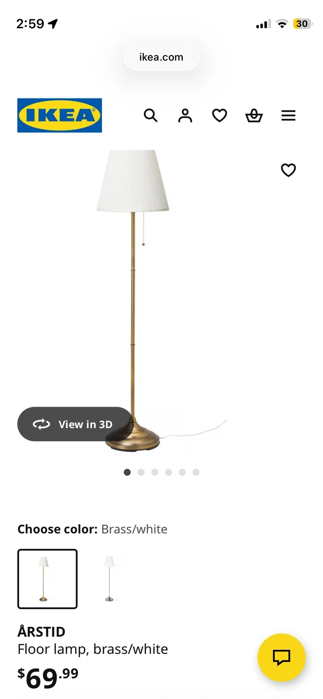 This IKEA ÅRSTID floor lamp has a classic design with a brass finish and a white pleated shade. It's perfect for adding ambient light to your living room or bedroom. The lamp features a convenient pull-chain switch and a sturdy base.