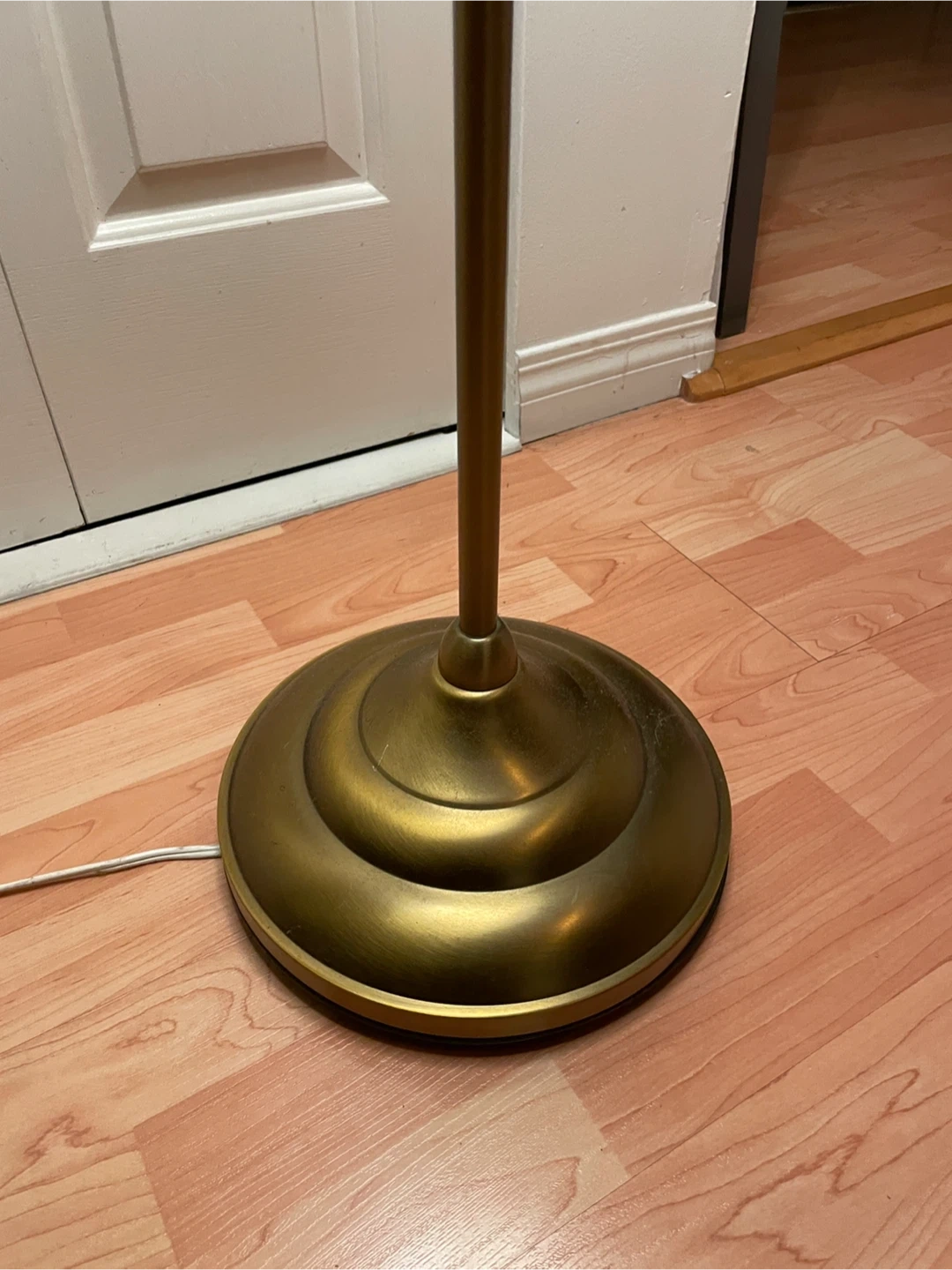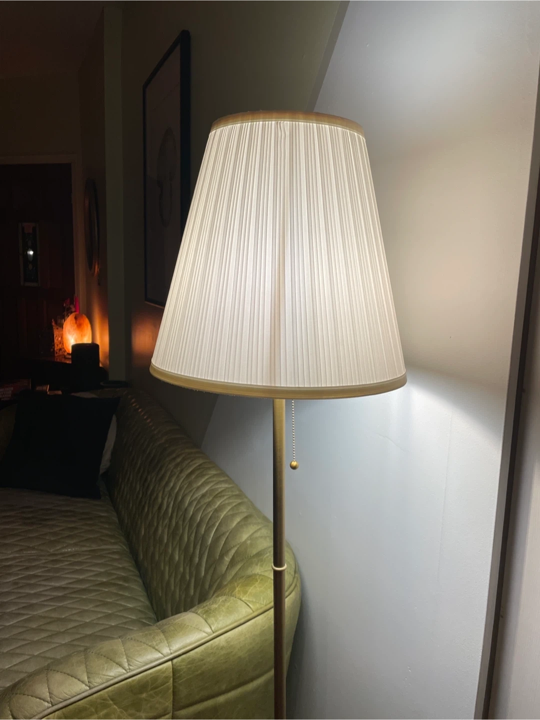 This IKEA ÅRSTID floor lamp has a classic design with a brass finish and a white pleated shade. It's perfect for adding ambient light to your living room or bedroom. The lamp features a convenient pull-chain switch and a sturdy base.