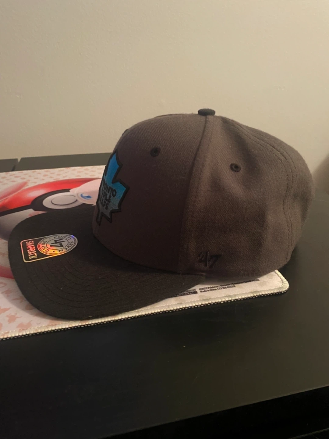This is a Toronto Maple Leafs snapback hat from '47 Brand. It features the NHL Eastern Conference logo on the side and "Maple Leafs" embroidered on the underside of the brim. It's a snapback style, so it's adjustable.