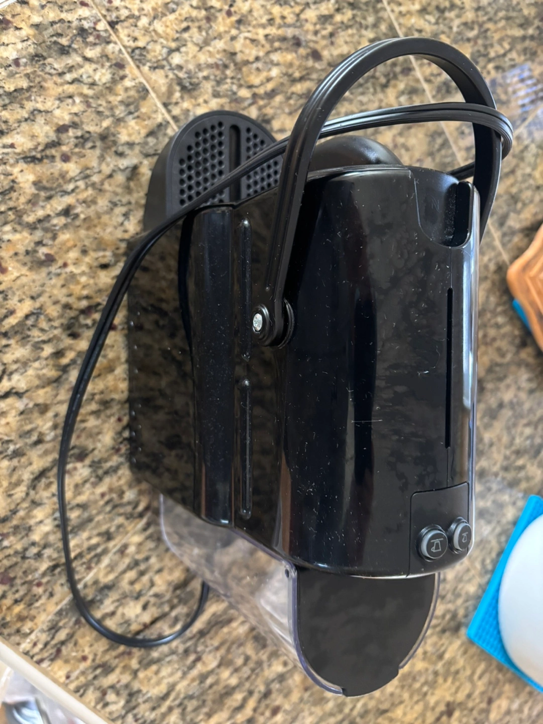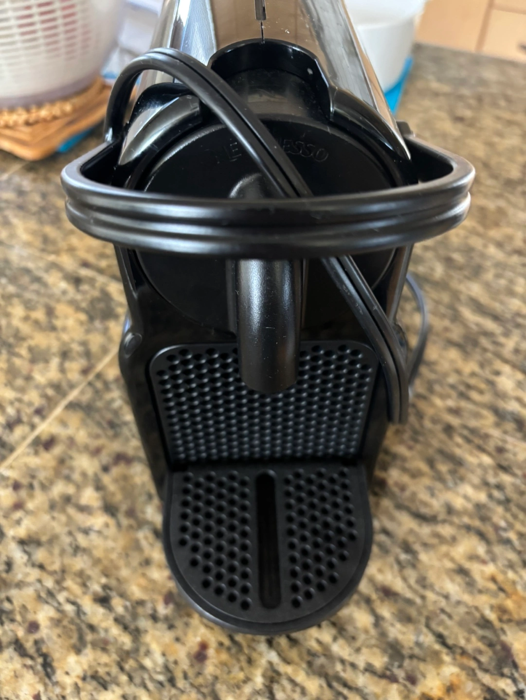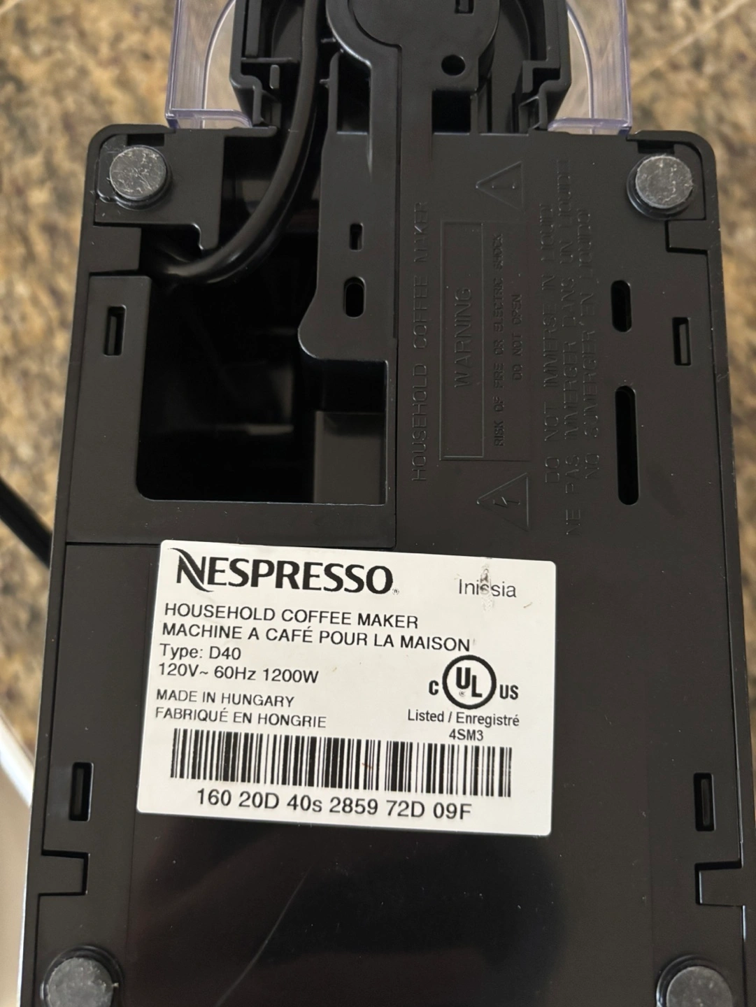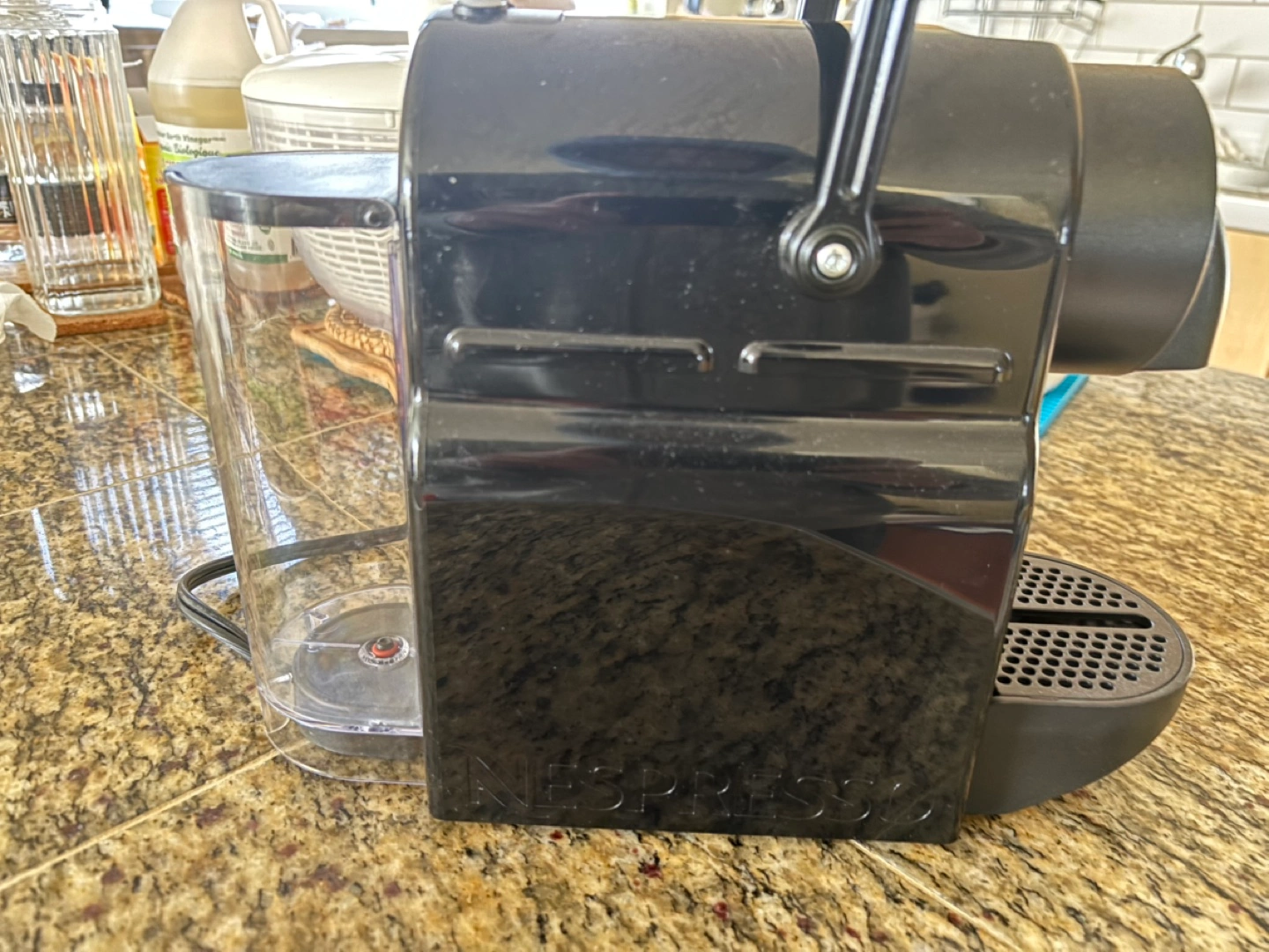 Black Nespresso Inissia coffee machine. Includes a water reservoir, a drip tray, and a capsule holder.