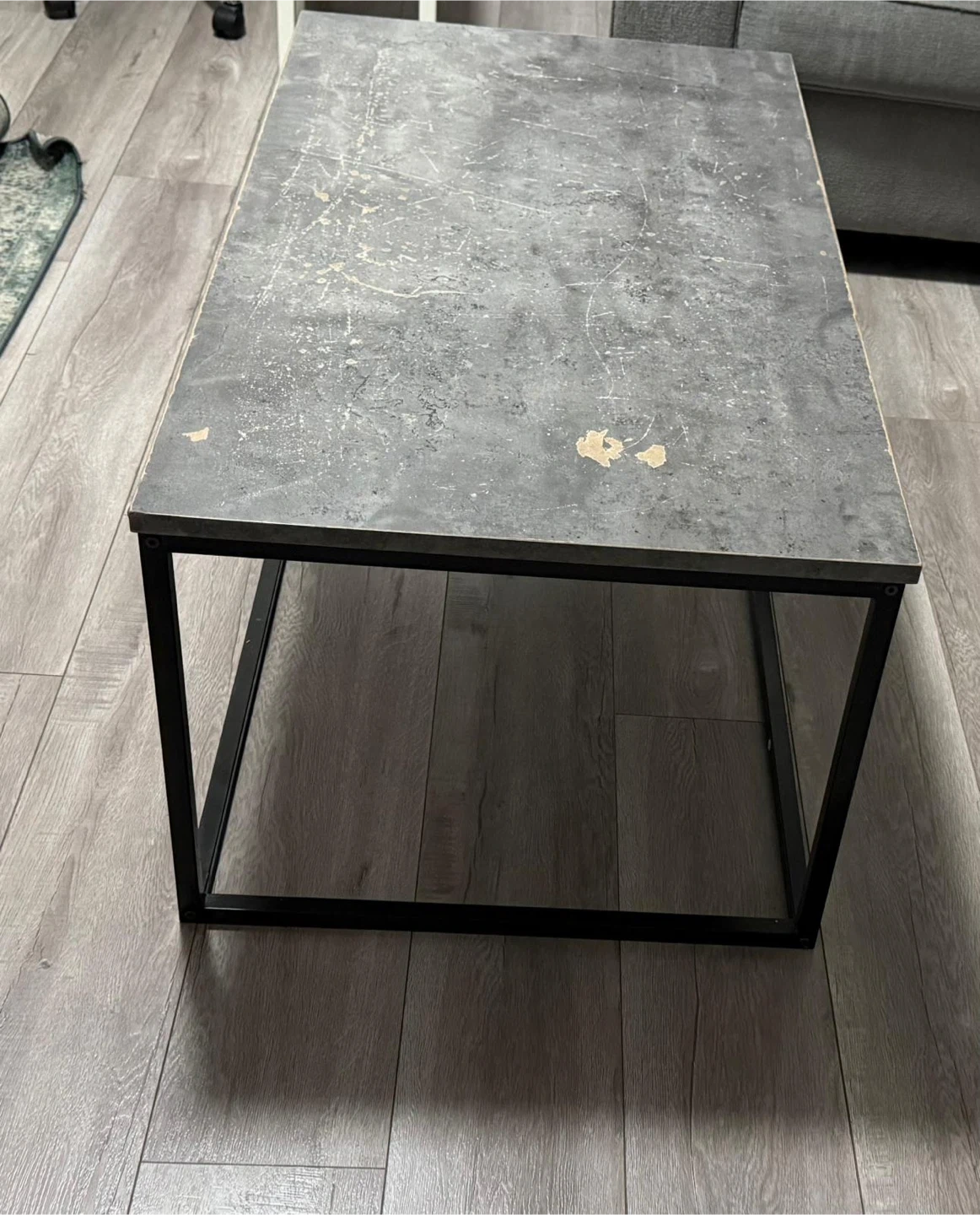Selling a grey coffee table. It shows some signs of wear and tear, as you can see in the pictures. It's still a functional piece of furniture! And very strong and perfectly fine
