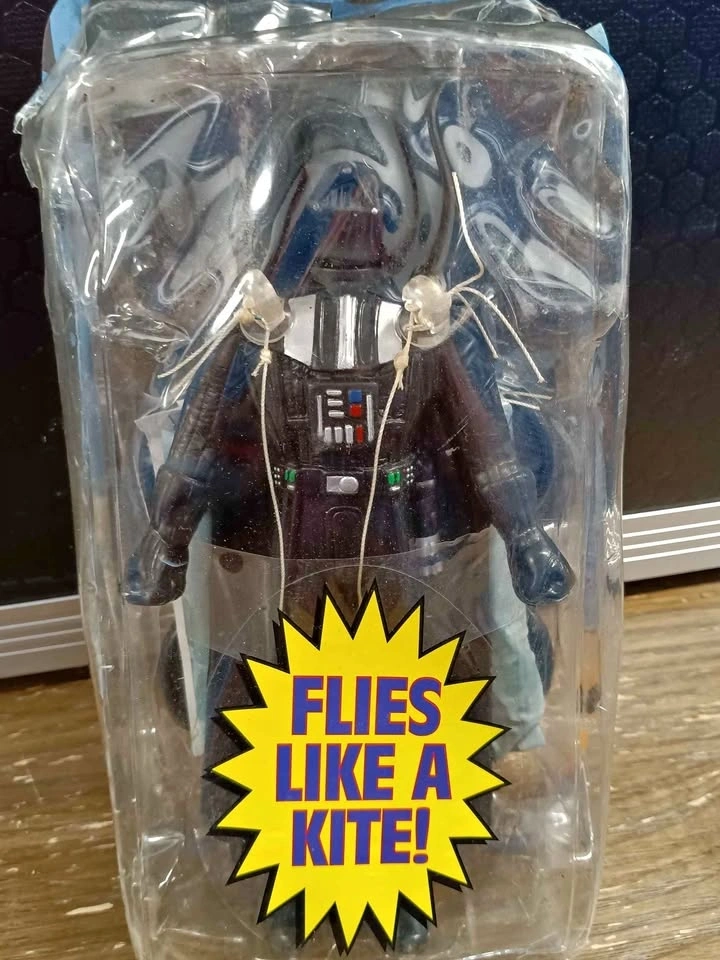 Collectible Darth Vader kite figure still in original plastic packaging. Includes assembly instructions and flying string. Figure is made of molded plastic with classic black and silver character details.