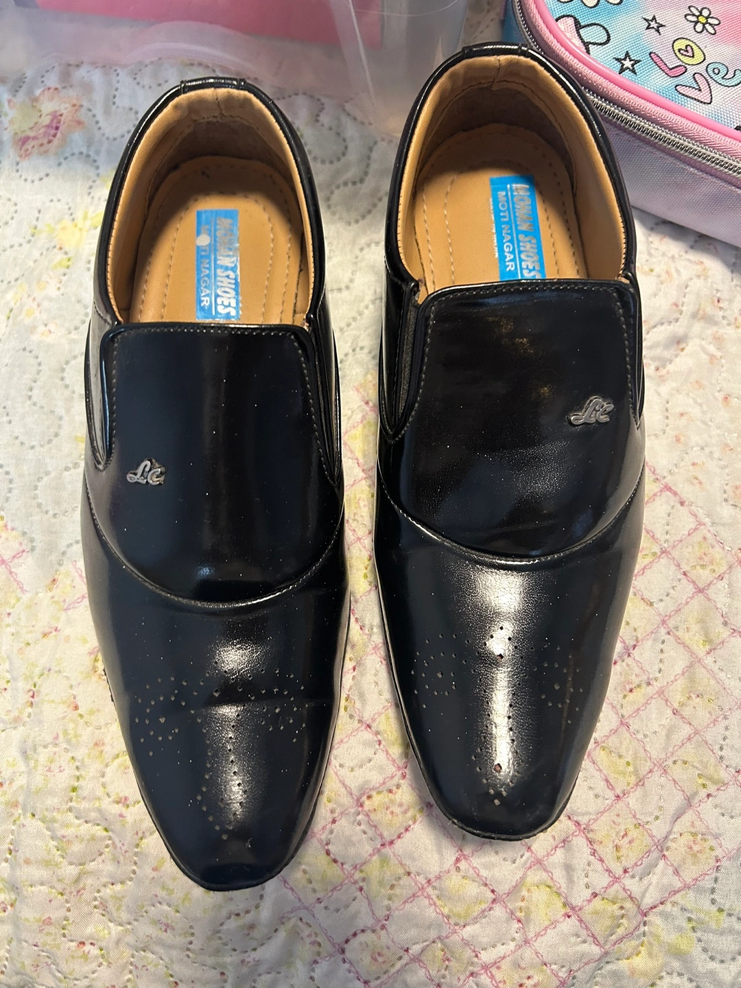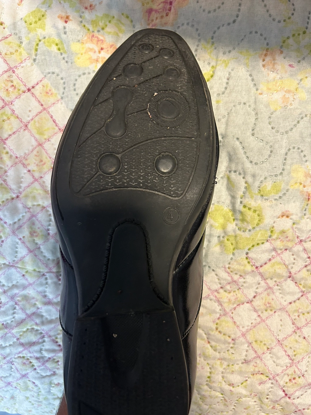 These are a pair of black leather slip-on shoes. They feature a pointed toe and a decorative detail of small holes. Size 4