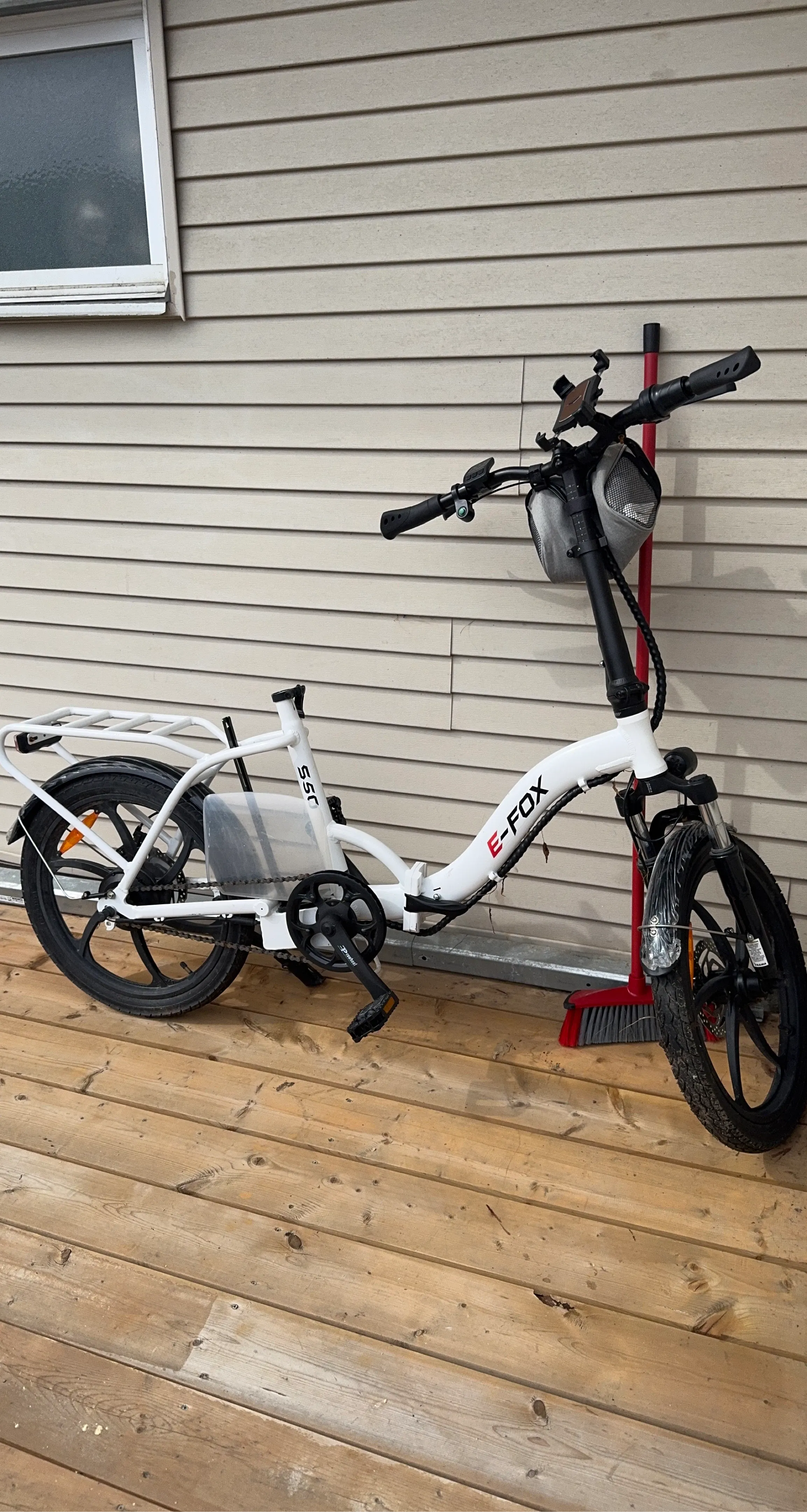 This is a white E-FOX electric folding bike. It has a rear rack and comes with a phone mount. Folding design for easy storage and transport.