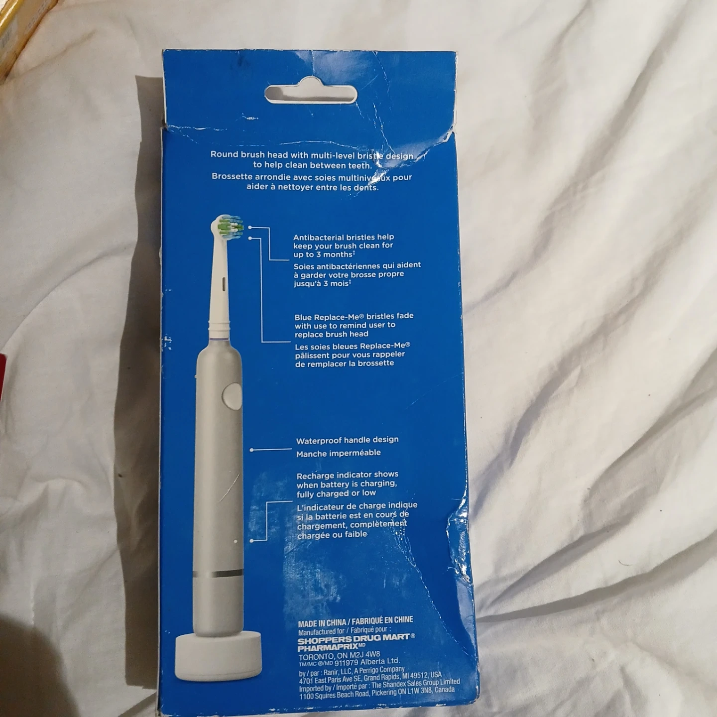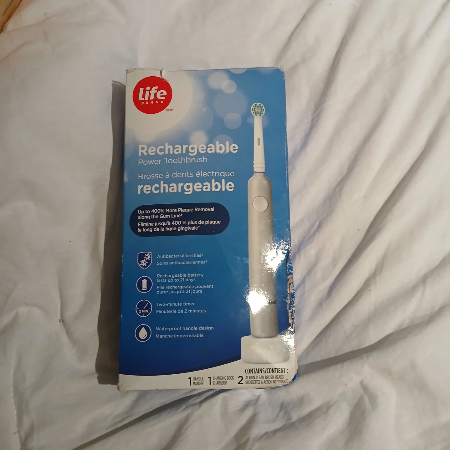Selling a Life Brand rechargeable power toothbrush. It's designed for up to 400% more plaque removal along the gum line! Features include antibacterial bristles, a rechargeable battery that lasts up to 21 days, a two-minute timer, and a waterproof handle design. Includes one handle and one charging dock. Box included